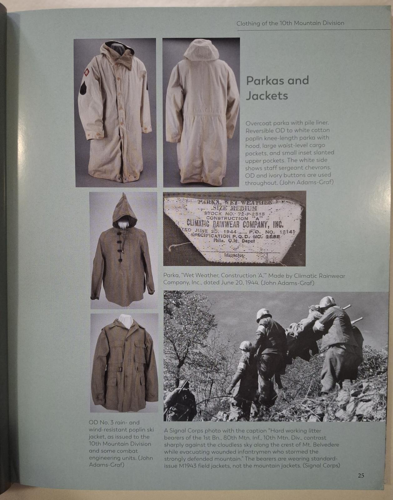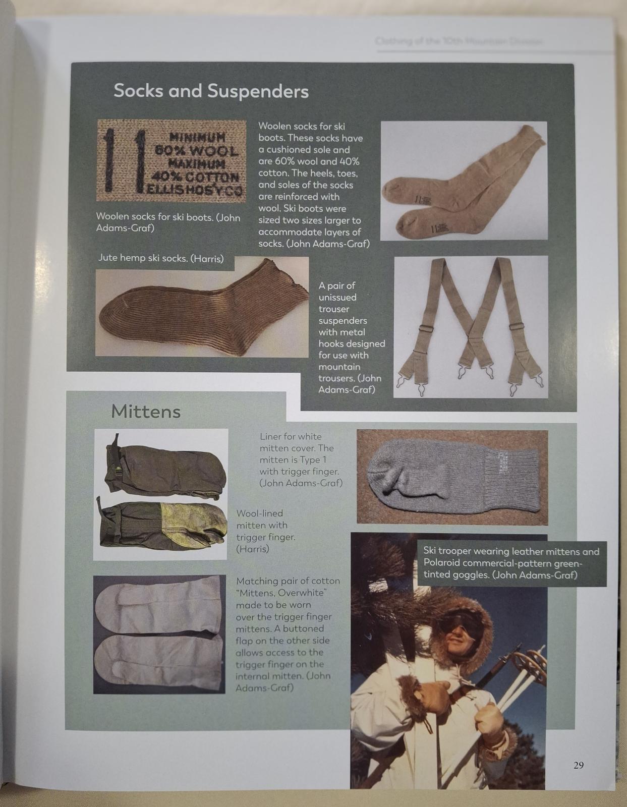 Through a series of brief descriptions and captioned photographs, Chapter 2 covers clothing and Chapter 3 covers equipment for movement over snow. Chapter 2 covers clothing used by the 10th Mountain from head to toe, including boots, socks, caps, sunglasses, helmets, parkas, pants, gaiters, and service uniforms.