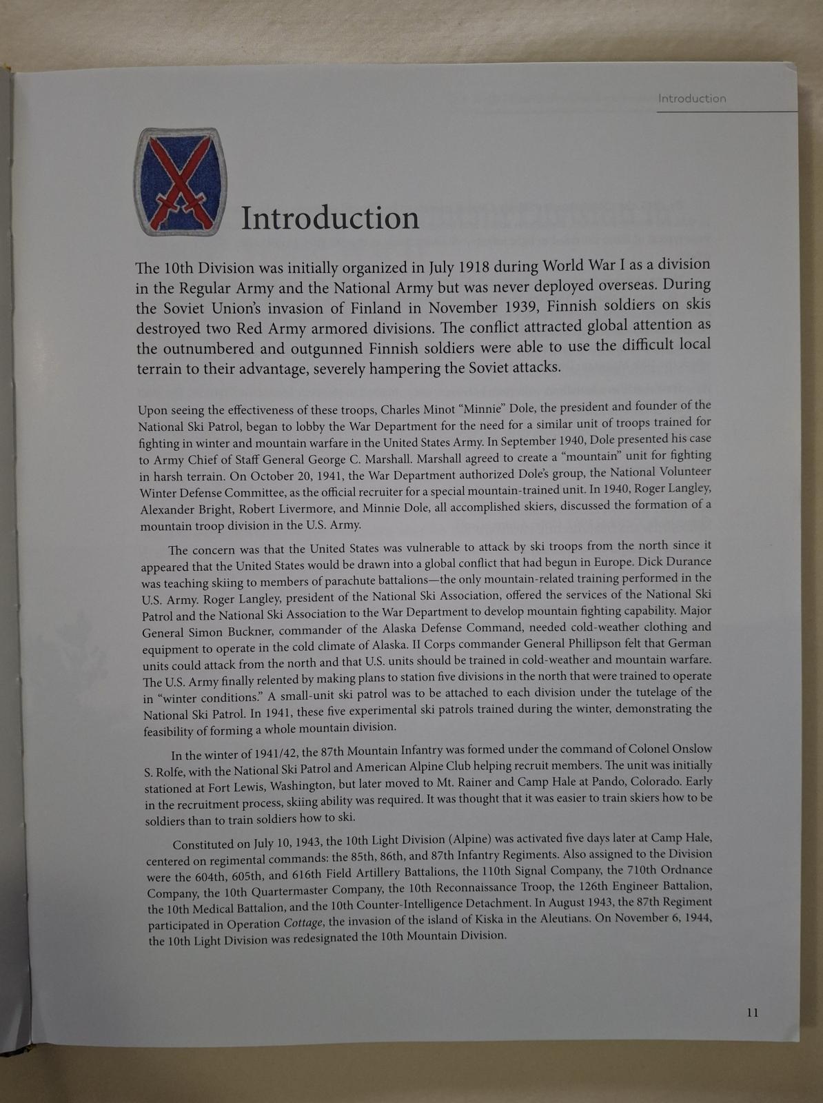 Chapter 1 gives a detailed history of the formation, training, and military actions of the 10th Mountain Division. Initial formation was in November 1940 when the War Department formed ski units as part of the 1st, 3rd, 5th, 6th, 41st, and 44th Divisions. The 1st started training in Plattsburg and Lake Placid, New York that month. In April 1941, Colonels Walker and Hurdis were charged with finding a training location capable of supporting 15,000 troops. Initial members of the 10th Mountain were drawn from experienced skiers and mountaineers. It was decided that it would be far easier and faster to train skiers to be soldiers than to train soldiers how to ski.