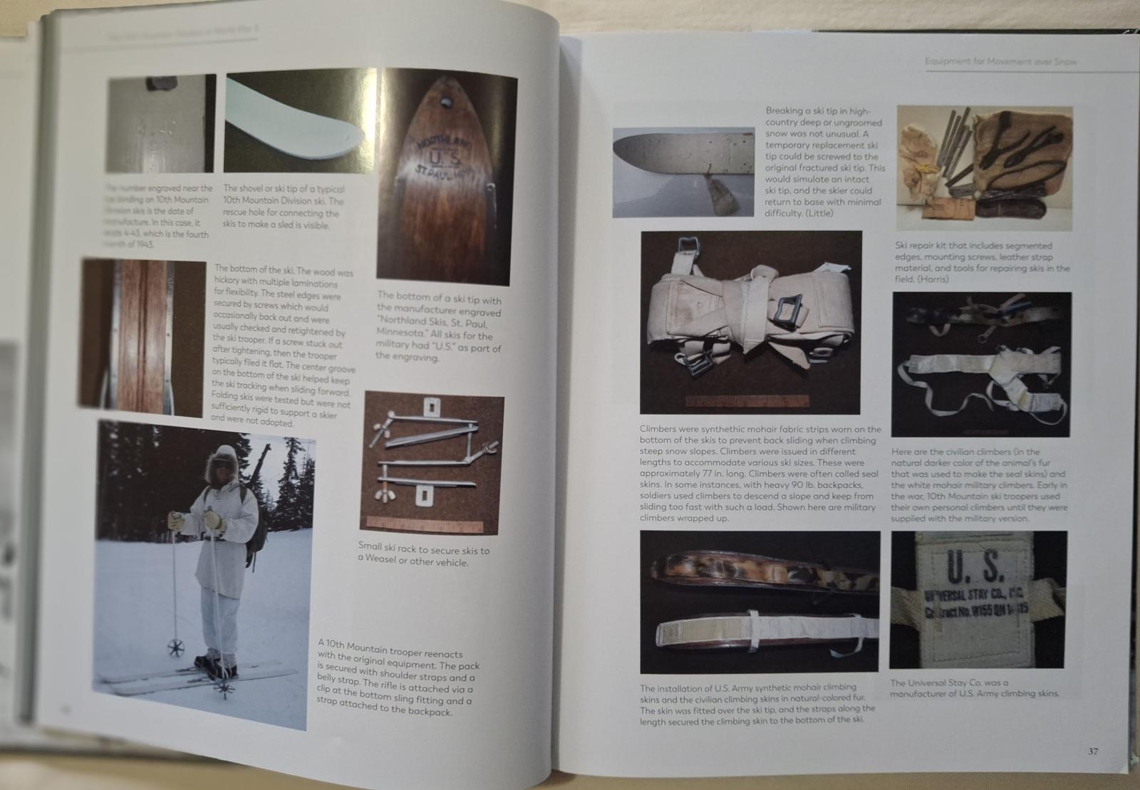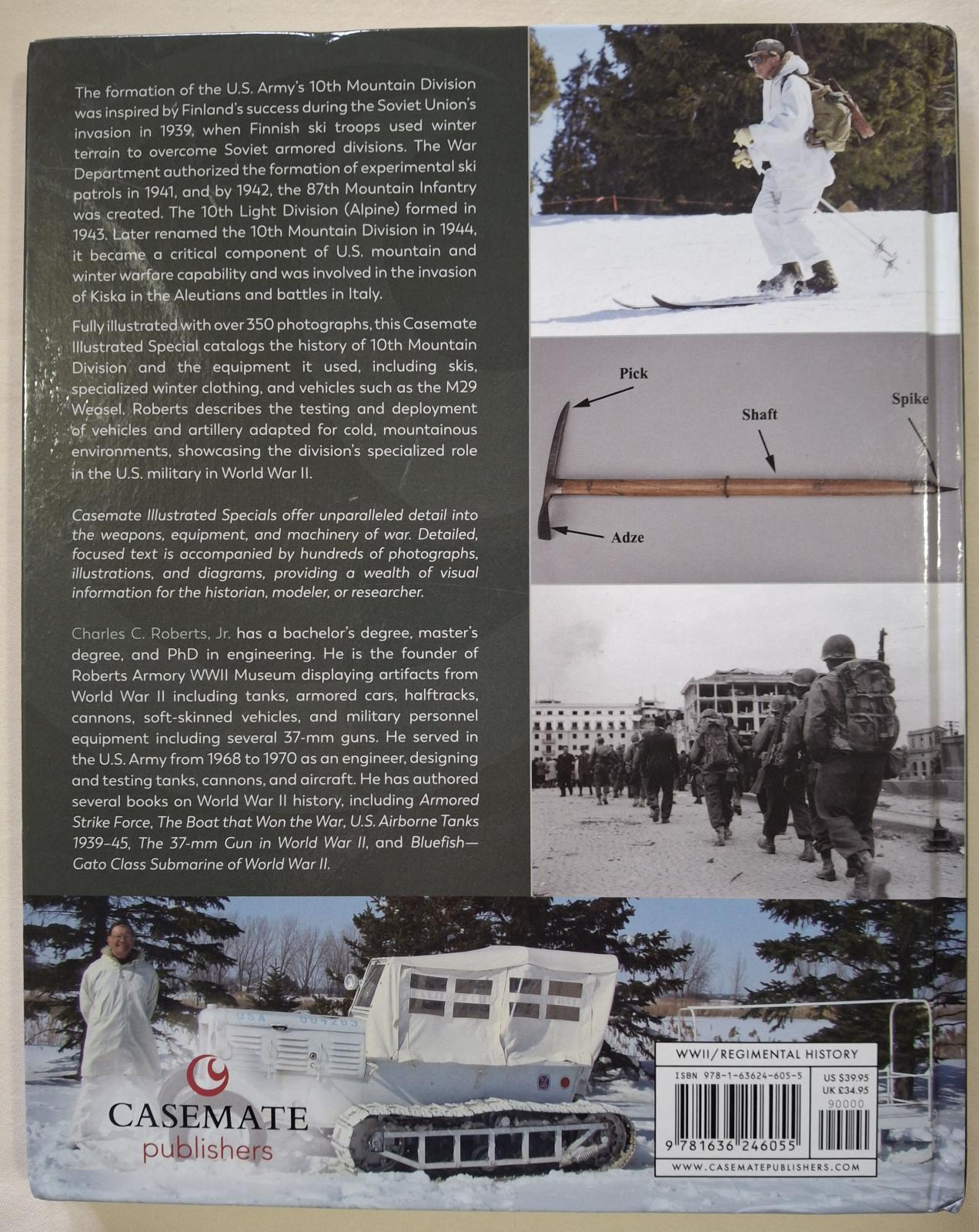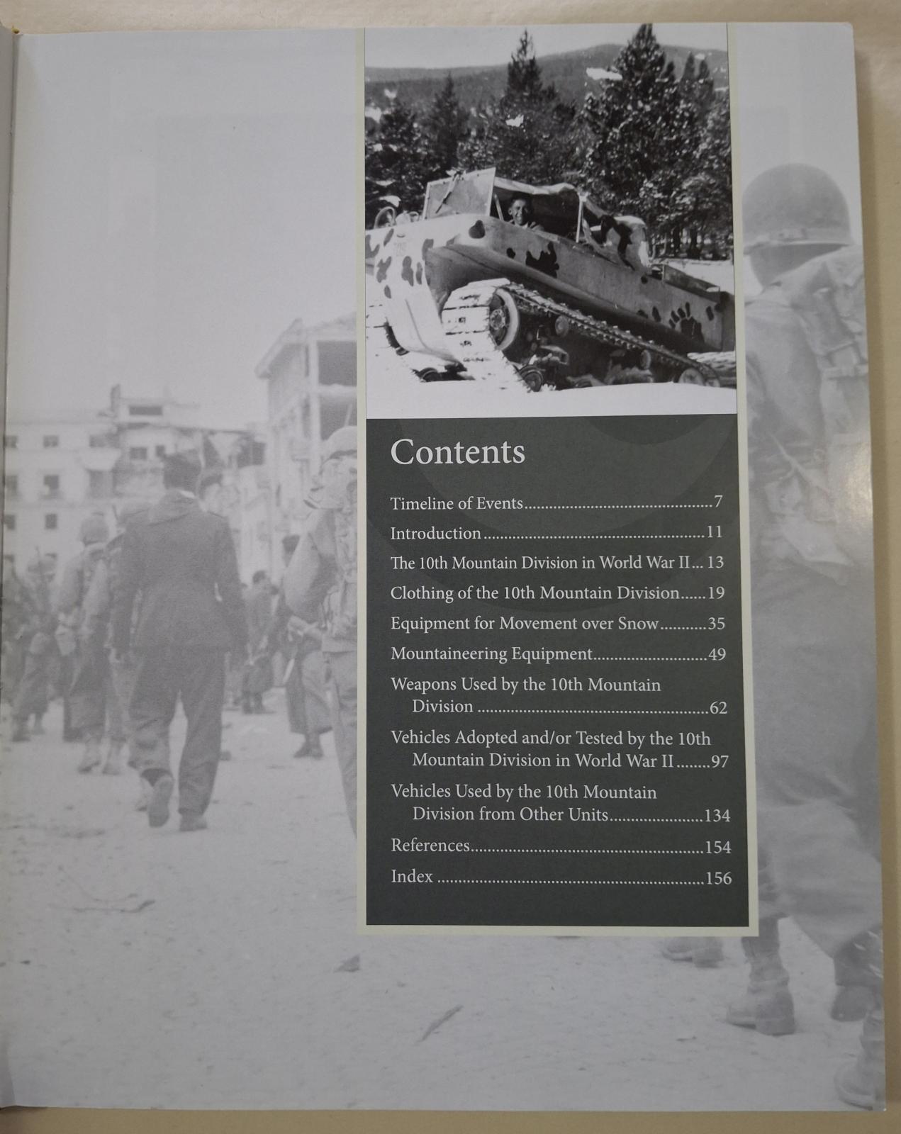 Fully illustrated with over 200 photographs, the book catalogs the history of the 10th Mountain Division unit and the equipment it used to undertake its unique mission, including skis, specialized winter clothing, and vehicles such as the M29 Weasel, designed for mountain and snow operations. The book also highlights the testing and deployment of various vehicles and artillery adapted for cold, mountainous environments, showcasing the division's specialized role in the U.S. military in World War II.