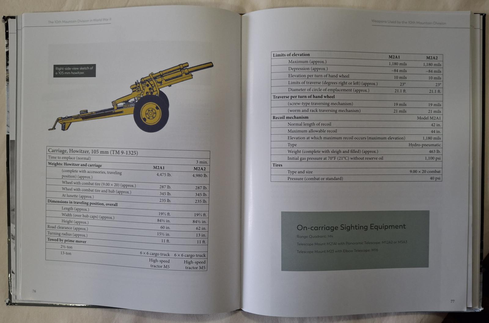 Chapter 5 introduces the reader to the weapons used by the 10th Mountain Division. Weapons cover everything from the 75mm Pack Howitzer to the .50 caliber M1911 semi-automatic pistol. Like the previous chapters, the weapons are presented with a description of the weapons and their use by the Division. An interesting addition to this and later chapters is an extremely detailed table of information on the weapon. These tables cover everything from the usual weight, length, width, height of the weapon down to detail such as muzzle velocity, rate of fire, and type of firing mechanism. One notable item missing a descriptive table is the M3 .45 caliber submachine gun or “grease gun.”
