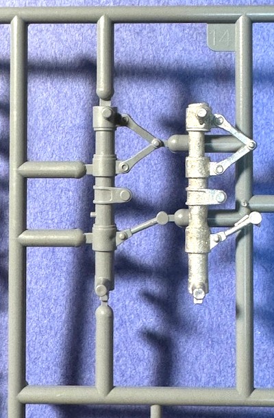 For my hits of this landing gear set, I will start by mentioning that the folks at SAC do a nice job with their level of detail, as it can be challenging to get reasonably crisp detail in white metal. The items in this set are mostly clean (the parts will only require some mold line removal) and it should not be a challenge to install them in their proper places on the Model Collect kit. For this review, I photographed the SAC parts next to the items that they will replace in the kit to allow the reader (and potential buyer) to see how they compare. A big hit is the inclusion of both the USN and USAF nose landing gear, as the Air Force does not need the catapult bar. I also like the main landing gear being solid metal pieces as the kit has front and back halves that are hollow in the middle. As is typical for SAC landing gear, I did not identify any misses for this set.