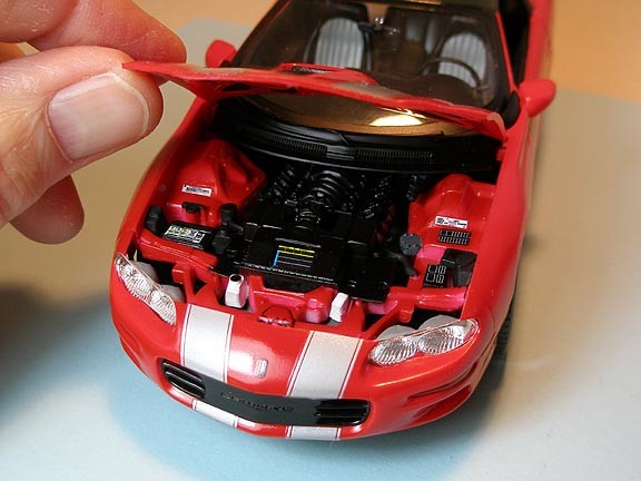 The hood hinge pins are small and delicate, so care has to be used not to shear one off when operating the hood---I enlarged the fenders’ holes a little bit to ease the strain on the pins. A little sanding on the edges of the hood resulted in a good fit side-to-side, but I wasn’t real satisfied with its fit at the front clip. The models shown on the box art are the same way, so I think that’s just a slight mis-molding of the hood profile. The only problem I had with the basic assembly was fitting the lower radiator hose into place.