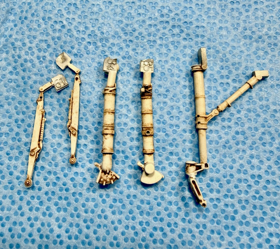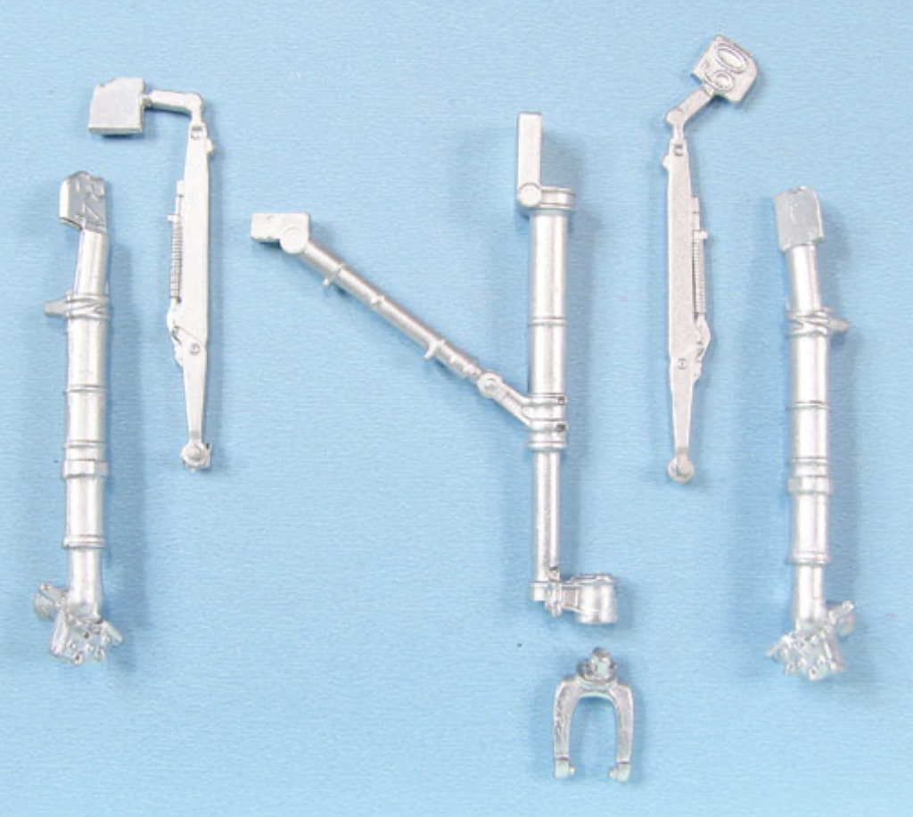 While the Magic Factory’s A-4M kit is a great kit in itself, this aftermarket kit provides two aspects which will aid in completion of the base kit: (1) all of the small details are faithfully replicated in white metal (including expansion marks, collet rings, attachment points for both the rear and front wheels and gear retraction bar) and (2) the added weight provided by the white metal itself adds not only to the strength of the landing gear but more importantly the sheer weight itself of the metal gear parts.