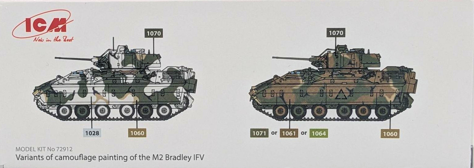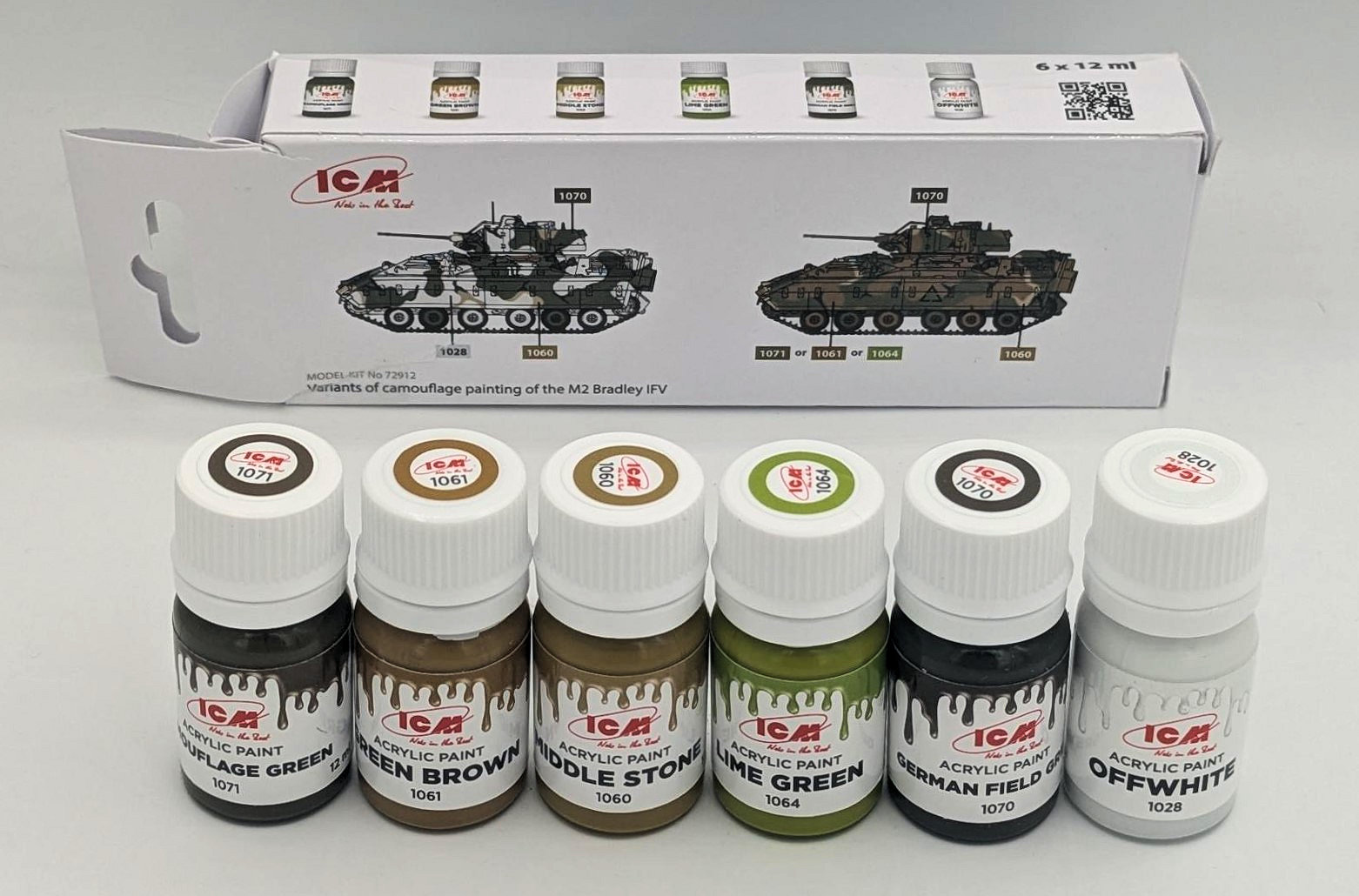 ICM continues to be prolific with both kits and paint sets. The Acrylic Paint Set for US Armored Vehicles 1990-2000s continues this trend and consists of six 12ml wide mouthed paint bottles. The front packaging includes a presentation of a M2 Bradley Infantry Fighting Vehicle. The back shows two M2 Bradley IFVs (Kit No. 72912) with color callouts for MERDC (Mobility Equipment Research & Development Center) Snow, Trees & Shrubs and Summer Verdant.