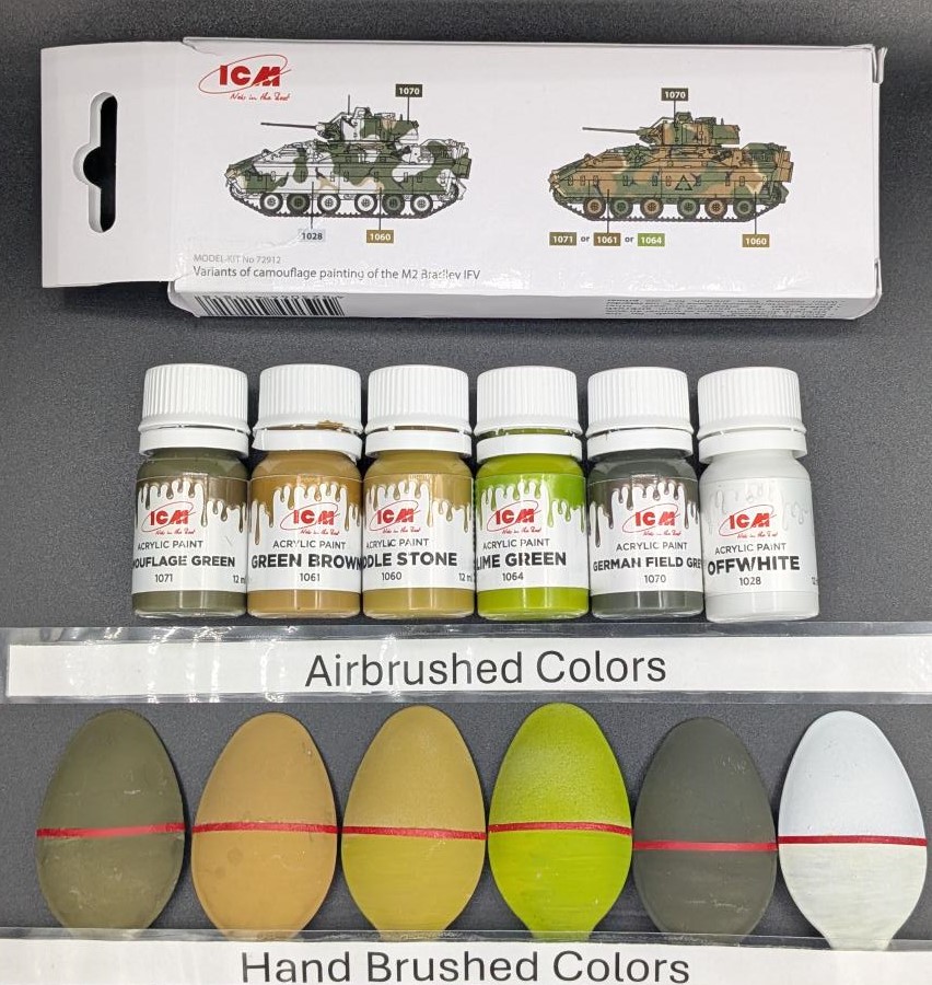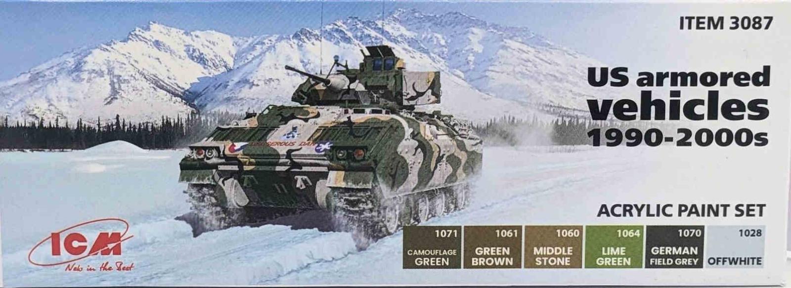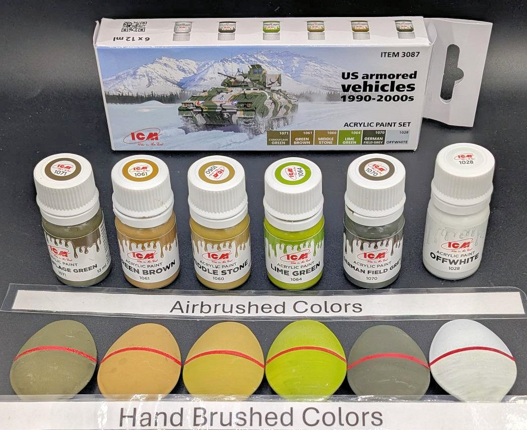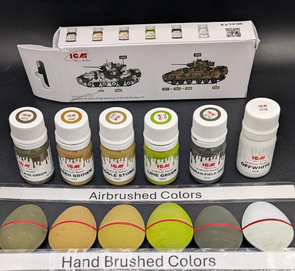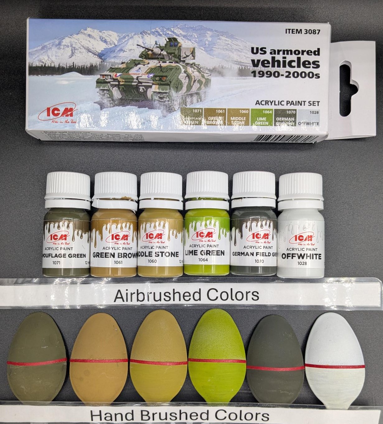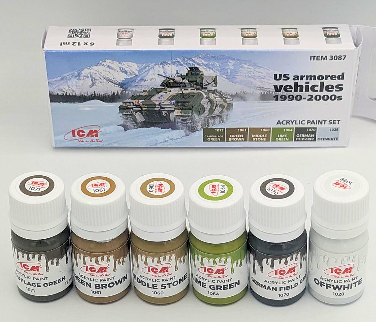 This is a good, one-stop acrylic paint set for US armored vehicles from the 1990s-2000s with the MERDC camouflage schemes. This is good paint for figures as brush marks disappear, and the paints are sturdy and dry matte. I look forward to using this paint set with an upcoming review of the ICM 1/72 M2 Bradley IFV (ICM No. 72912) in Snow, Trees & Shrubs MERDC scheme.