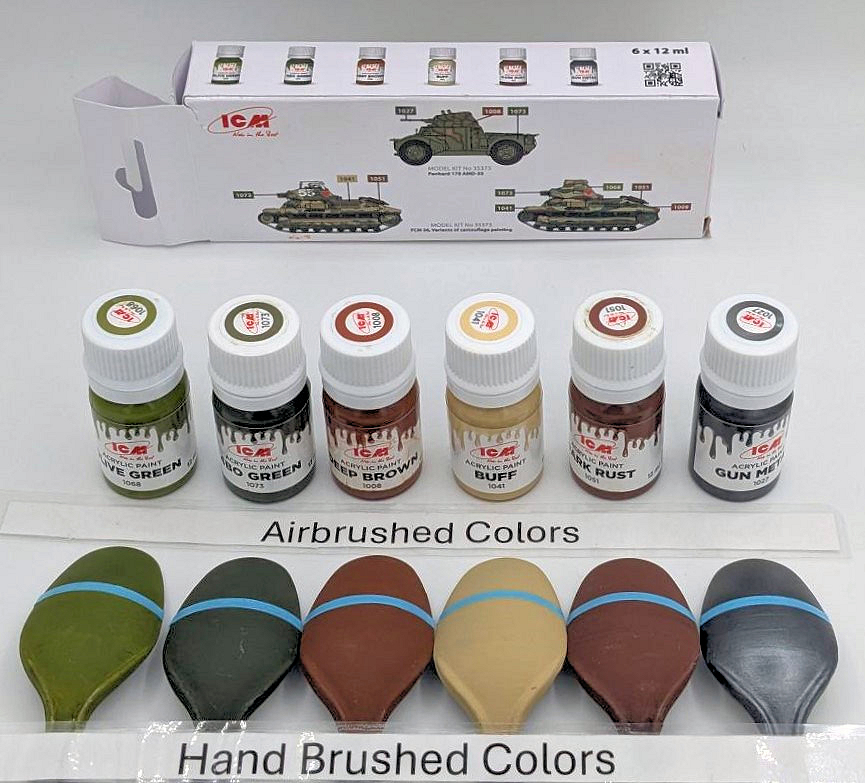 ICM selected Green 4BO and Olive Greens for this paint set. The greens called out in the ICM Diorama Series Battle of France, Spring 1940 consisting of a Panhard 178 AMD-35 (European and Dark Greens), FCM 36 (Flat and Light Greens), and Laffly V15T (US Dark and Olive Greens). The same applies to Buff where FCM 36 calls out Desert Yellow and Laffly V15T Tan Earth. ICM’s Panhard 178 AMD-35 and FCM 36 instructions pre-date ICM’s paint range. Regardless, the colors are close and provide a good overall set.