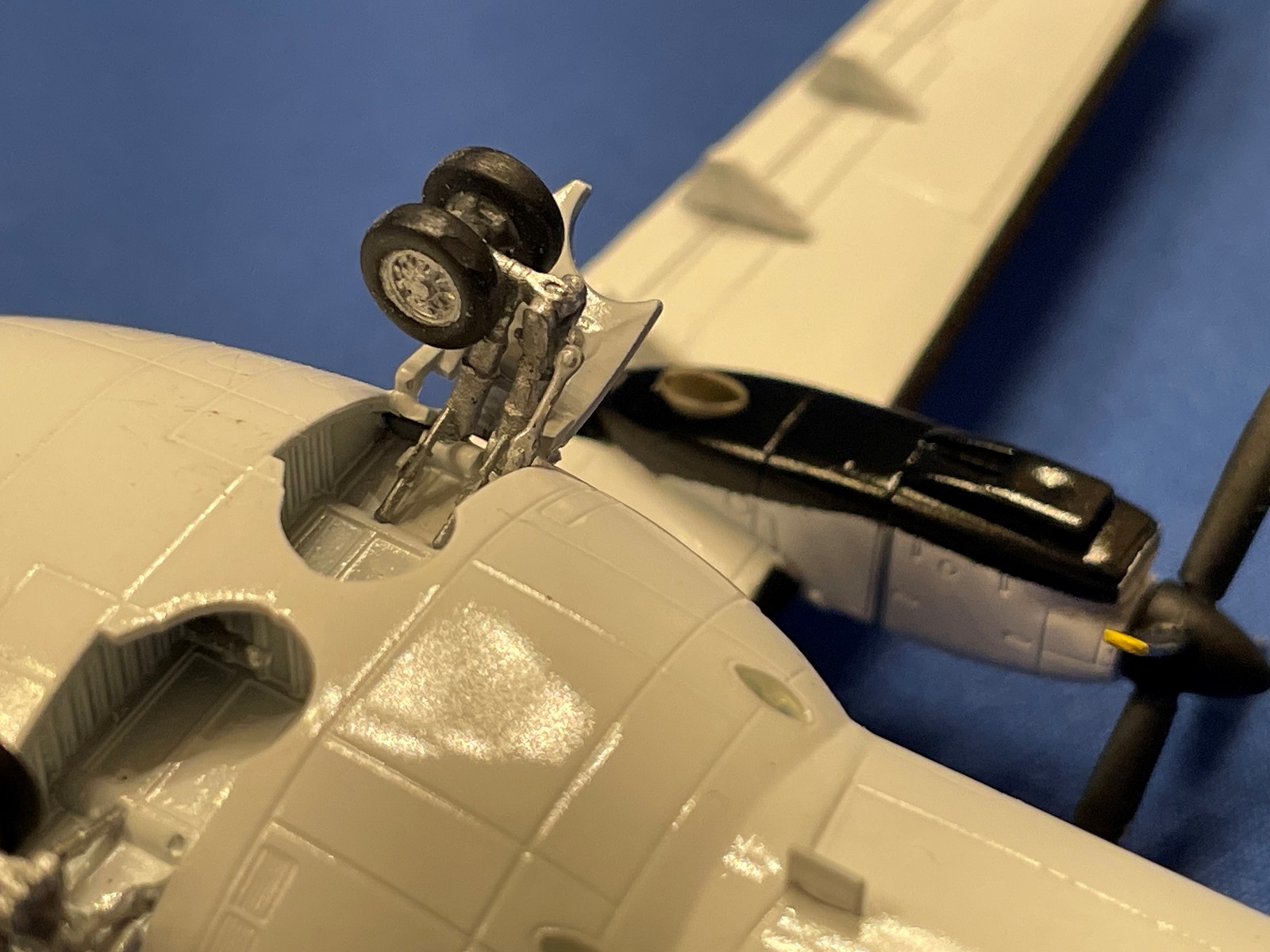 The main landing gear bay consisted of four parts. They assembled easily, after scraping away tiny mold lines, and slotted into a recess in a separate, lower belly sponson part. I determined that it would be impossible to attach the front landing gear leg and retraction strut into the nose gear bay after that was attached inside the fuselage, so I reluctantly glued it all together and through subsequent handling, broke the end of the delicate leg off! I glued it back on at the end of the build.