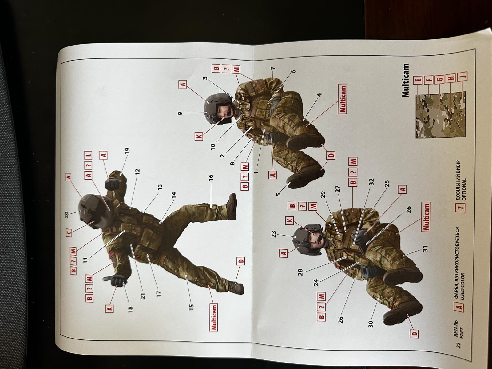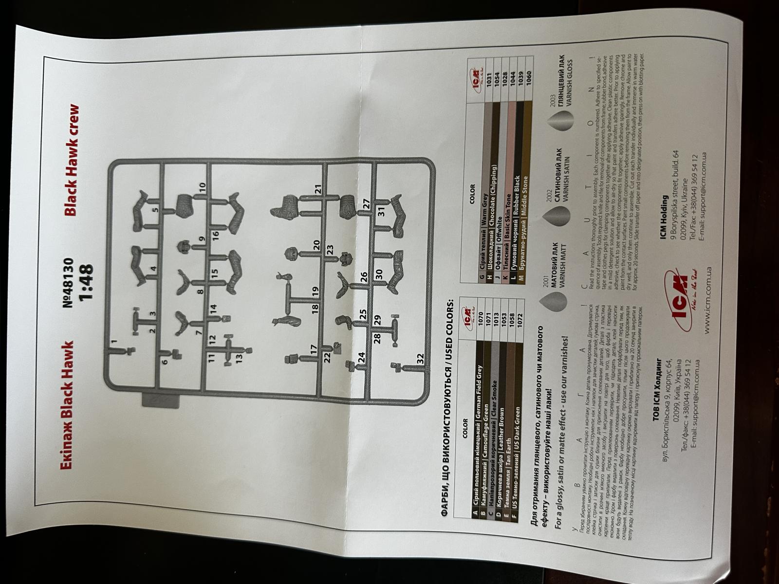 There are two pilots and a crew chief. The crew wear A2CU OCP flight suits with Aircrew Combat Equipment (ACE). There is a two-sided instruction sheet included that has the ICM paint numbers and full color of the subjects. A nice touch is the small box that explains the multicam camouflage colors and how they should look.