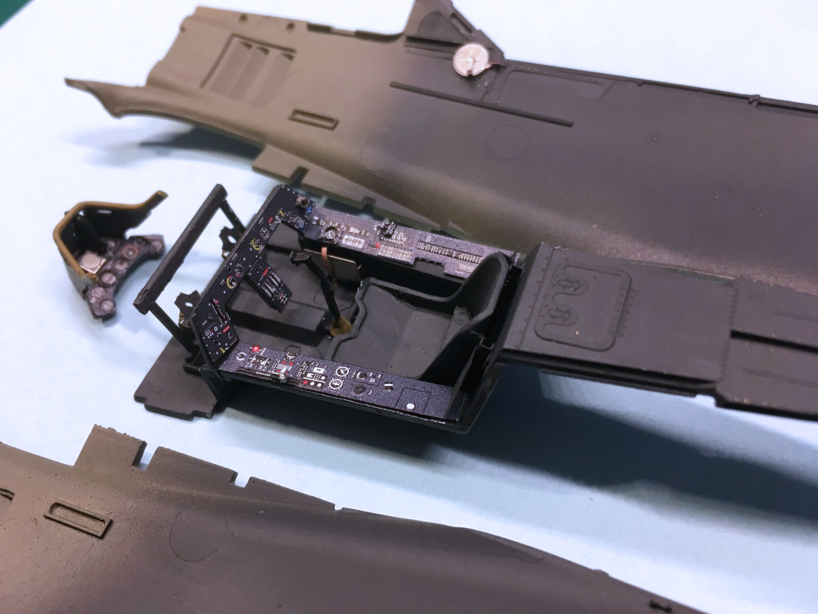 The entire set is extremely well detailed. The end result is excellent! I am very pleased with how everything turned out. I did not find any significant discrepancies in my research of the full-size version represented in the kit. Most of the challenges I had with the set related to my mistakes and skill level. The small handles and levers were difficult for me to work with, so keep your tweezers sharp and your magnifiers clean! Many of those small parts are color-laminated on one side only, so place color side out to the visible side, or paint the part. The seat rails were very tricky to fold per spec and I did not find the instructions particularly helpful in this area. The back plate (wider one) separated and broke off from the narrower folds. I glued the larger piece into the cockpit tub first, then the rails. Plan for this, so you do repeat my mistakes. Another issue was with part 33, the right side rail interior detail. In order to get part 33 in, you must also trim off the round socket on part C12, the right fuselage half. The instructions show that there is material should be removed, but it was not clear to me that the kit socket for kit part F57 should also be removed and replaced. The canopy modifications were a bit frightening for me (fear of damaging clear parts) but the final effect turned out to be very satisfying. I am very pleased with how this excellent set came together.