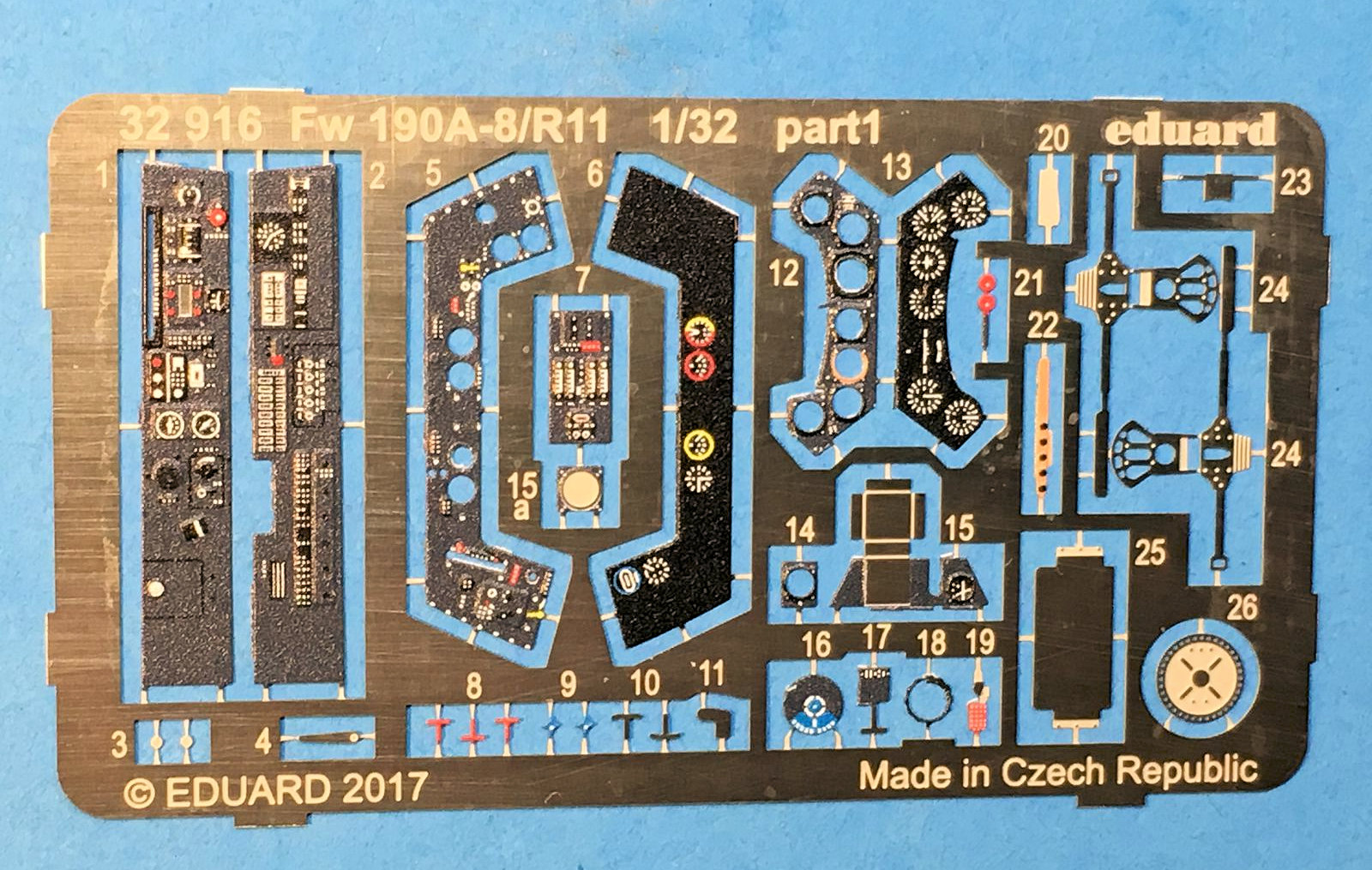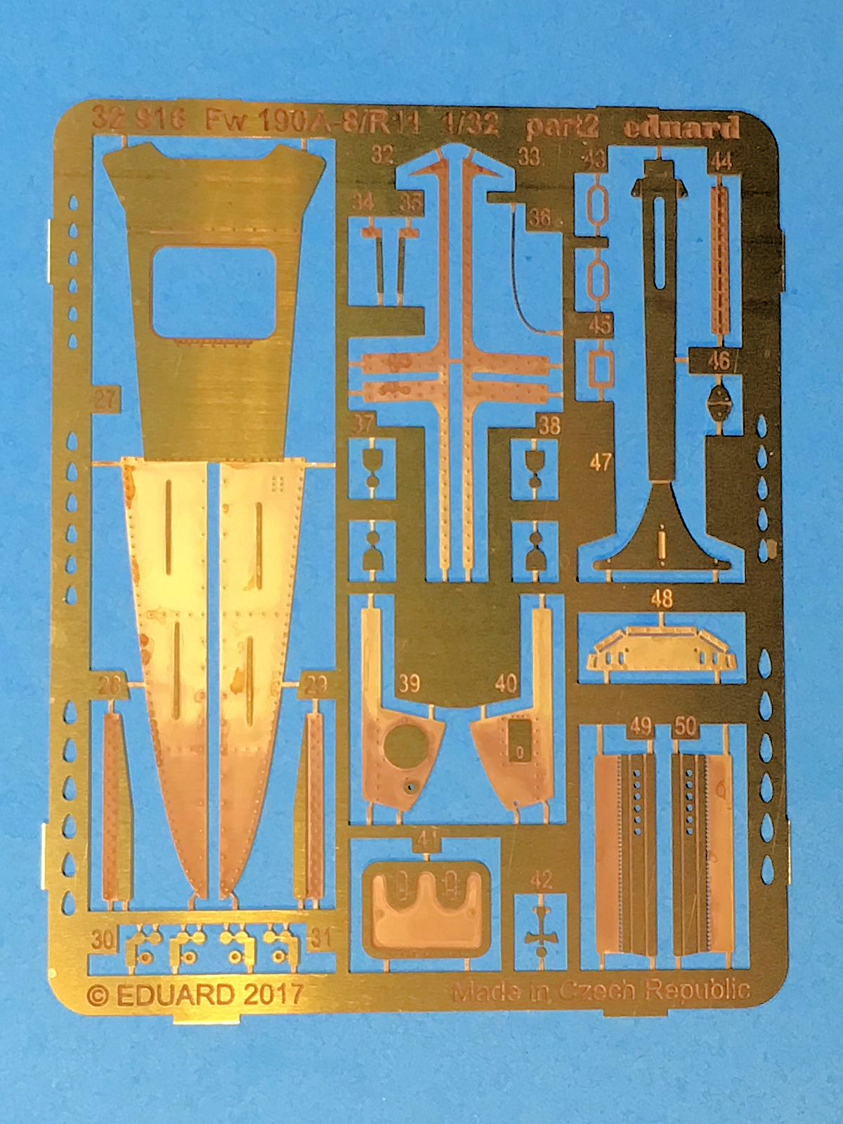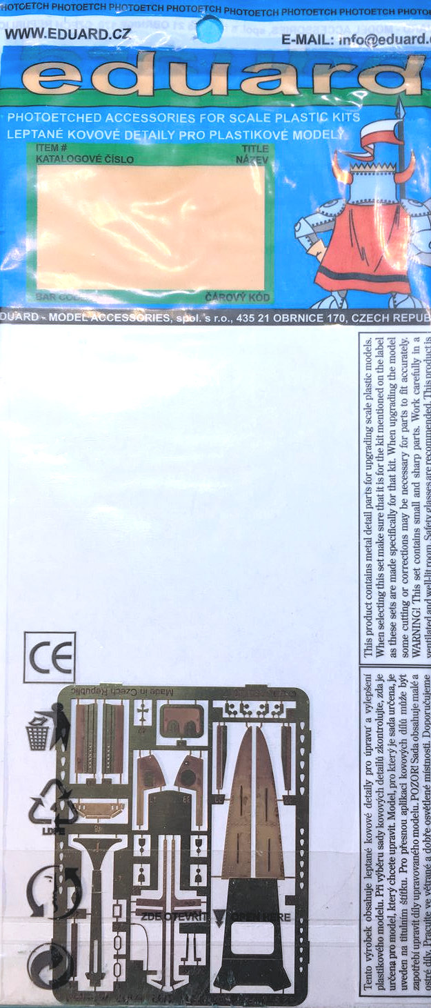 The photoetch frets arrived in excellent shape in an easily opened re-sealable plastic package with the distinctive Eduard knight logo. The frets are color-laminated for the instrument panels and relief-etched polished brass for other details. The parts are crisply executed. Color instruction sheets are included in the package, and Eduard has the same instruction sheets available for download on the product page. I really appreciate having the electronic PDF format to mark up on my computer, especially the ability to enlarge the details on my computer screen.