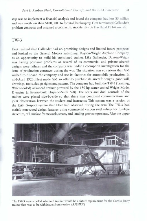 Dr William Wolf delivers a tour de force on the founder of Consolidated, Reuben Fleet, and the factories that would manufacture the Consolidated B-24 Liberator. The first Consolidated manufactured aircraft was the TW-3 (Training, Water-Cooled) advanced trainer. The Dayton-Wright Company had just begun manufacturing this side-by-side trainer when General Motors (who had bought Dayton-Wright in 1919) closed the company down in 1923. Reuben Fleet acquired the TW-3 contract along with its chief designer, Colonel Virginius E. Clark, from General Motors. The TW-3 would begin being delivered as the Consolidated TW-3 as viewed at the bottom of Page 31. Unfortunately, when evaluated by instructors at Brooks Field in San Antonio, Texas, Reuben Fleet found that the instructors did not like the side-by-side seating in the TW-3. A clear view of landing the plane was quite important to the instructors and being on one side or the other obscured the view of the opposite side. The Army supported a change to a tandem arrangement which was made by adding longerons. The end result was a hump between the tandem cockpits, resulting in the instructors referring to the revised TW-3 as the Consolidated Camel.
