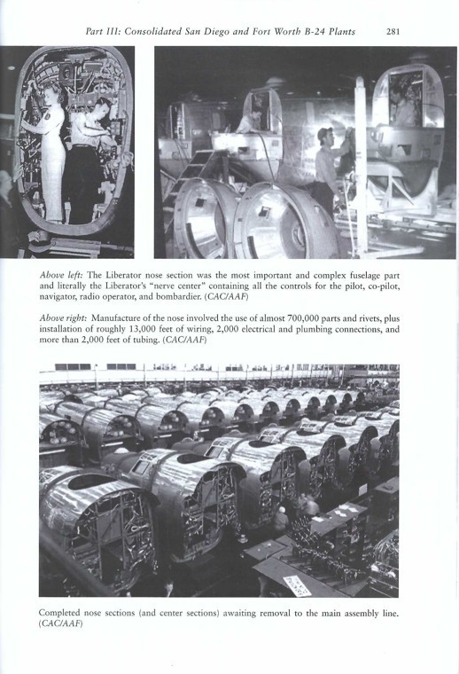 All five manufacturing plants are addressed, starting with the Consolidated Sand Diego facility. The Liberator nose section was the most complex section with all controls for the pilot, co-pilot, navigator, radio operator, and bombardier. The first B-24 Liberators were essentially hand-built, as were most aircraft of the era. As B-24 orders increased, there were three major expansions at the San Diego plant. The original plant was 247,000 square feet, but by the end of 1942, the square footage had increased to 3,363.000. True assembly line production would not be achieved until 1944 using lessons learned from the Ford Willow Run manufacturing facility. Assembly line photographs of the nose section assembly can be seen on Page 281. The nose section was composed of almost 700,000 parts, plus 13,000 feet of wiring, over 2,000 feet of tubing, and 2,000 electrical and plumbing connections.