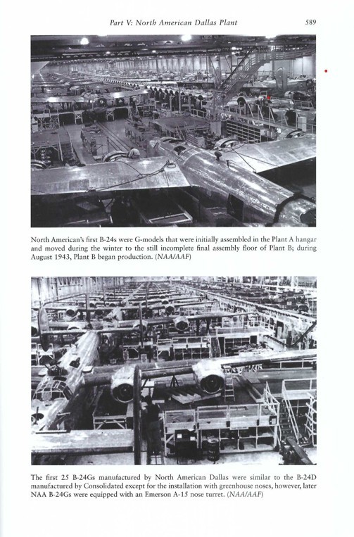 Significant attention is paid to the Consolidated San Diego, Consolidated Fort Worth, and the Ford Willow Run manufacturing plants. The North American manufacturing plant in southwest Dallas and the Douglas Tulsa facility are also addressed. North American Dallas manufactured B-24G Liberators can be viewed on Page 589. The first 25 Liberators were similar to the B-24D and were built as the B-24G Liberator with a Sperry ball turret. The remaining 405 B-24G-1 Liberators built utilized am Emerson A-15 nose turret, making them similar to the B-24J. North American would produce 536 B-24J Liberators at the Dallas plant. When Liberator production stopped, the North American Dallas plant was to manufacture 1,000 Fairchild C-82 Packets, but with the war ending, only 3 were manufactured, leaving 977 partial airframes. North American occupied the government-owned manufacturing facility from August 1941 to August 1945. North American produced 20,000 aircraft, including B-24 Liberators, T-6 Texans, and P-51 Mustangs. The next tenant was Texas Engineering and Manufacturing Company [TEMCO]. TEMCO would act as a subcontractor for the Lockheed F-104 Starfighter, Lockheed P2V Neptune, McDonnell F-101 Voodoo, Boeing B-47 Stratojet, and the Globe Swift. April 8, 1948, saw Chance Vought Aviation sublease space from TEMCO as Vought began to manufacture F4U Corsairs, and later F7U Cutlasses and F8U Crusaders. TEMCO would merge with James Ling, an electronics firm, and later merged with Vought in 1963, creating the LTV Corporation. The LTV A-7 Corsair II would be the next aircraft manufactured in the facility. Northrop Aviation bought LTV Corporation in 1991, and the plant would become Vought Systems of Northrop-Grumman, primarily making sub-assemblies. Subcontracting would include the Boeing 747, 757, and 767, in addition to the B-2 and McDonnell Douglas C-17.