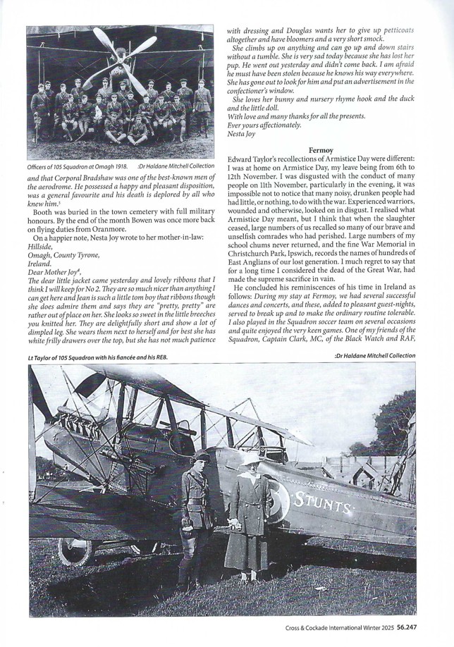 Peter Ewer is up next with The RAF 3a: Britain’s Unloved V12. This five-page case study has five black and white photographs along with four drawings from the National Archives. The Royal Aircraft Factory RAF3a water-cooled V12 engine was built by D. Napier and Son. It went into service with 18 and 49 Squadrons, powering their de Havilland DH4 bombers. Supposedly able to produce 260hp, 260 examples were built by D, Napier and Son with 29 built by Armstrong Whitworth. Additional pictures of RAF3a powered de Havilland DH4 aircraft in service with 19 Training Squadron operating in Ireland in Guy Warner’s article that follows. The second part of Guy Warner’s history of the Show of Prescence: The RAF Operations in Ireland, 1918-1920 spans twenty-five pages and includes fifty black and white photographs and three black and white maps. Two black and white pictures of 105 Squadron can be found on Page 56.247. The upper photograph features 105 Squadron officers in front of a Royal Aircraft Factory designed R.E.8. The picture at the bottom of the page shows Lt. Edward Taylor posing with his fiancée in front of his R.E.8.