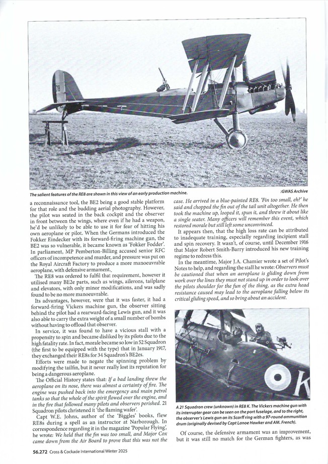 Peter Brand’s entry is Lt John Kingsbury: 21 Squadron RFC/RAF. This is a nine-page biography with seventeen black and white photographs based on his personal diary, photograph albums, and flightlog supplied by his daughter. John was posted to 21 Squadron with the R.E.8 on August 25, 1917. An early R.E.8’s side profile is shown at the top of Page 56.272. Another 21 Squadron crew is depicted in their R.E.8 at the bottom of the page. Kingsbury was finally sent home to be an instructor on May 22, 1918, providing new pilot training on Avros, DH4s, DH6s, BEs, and R.E.8s. John flew his last flight on January 25, 1919, having accumulated at total of 499 hours of flight time. A career change saw him entering medical school, where he would matriculate as an Ear, Nose, & Throat surgeon.