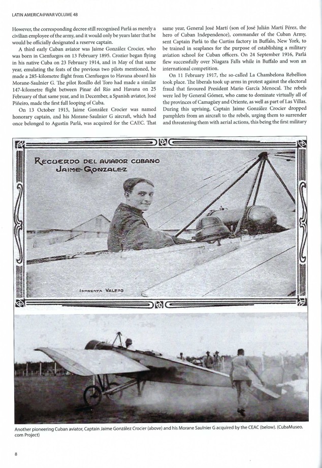 This first volume Cuban Aviation from Hélio Higuchi and Antonio Luis Sapienza Fracchia kicks off with hot air balloon flights in 1828. The first Cuban born aeroplane pioneer was Captain Jaime Gonzalez Crocier is shown at the center of Page 8. Crocier had traveled to France to study at Bleriot’s flying school in Chateaufort and earned his pilot’s certificate in December 82. Captain Crocier’s first Cuban flight was on February 23, 1914, the third to fly an aeroplane in Cuba. Crocier is also responsible for the first flight accident in Cuban as he managed to slam into an electric pole, damaging his aircraft. The photograph at the bottom of the page is Crocier’s Morane-Saulnier G [previously owned by Augustine Parlah] that would be the second military aircraft in Cuba. Crocier would drop leaflets during the Rebellion of the Chambeloneros in February 1917. Sadly, Crocier would die in a plane crash on July 4, 1920, shortly after take-off. Today, Crocier is remembered with his name on a small international airport near Cienfuegos, "Aeropuerto Jaime Gonzales".