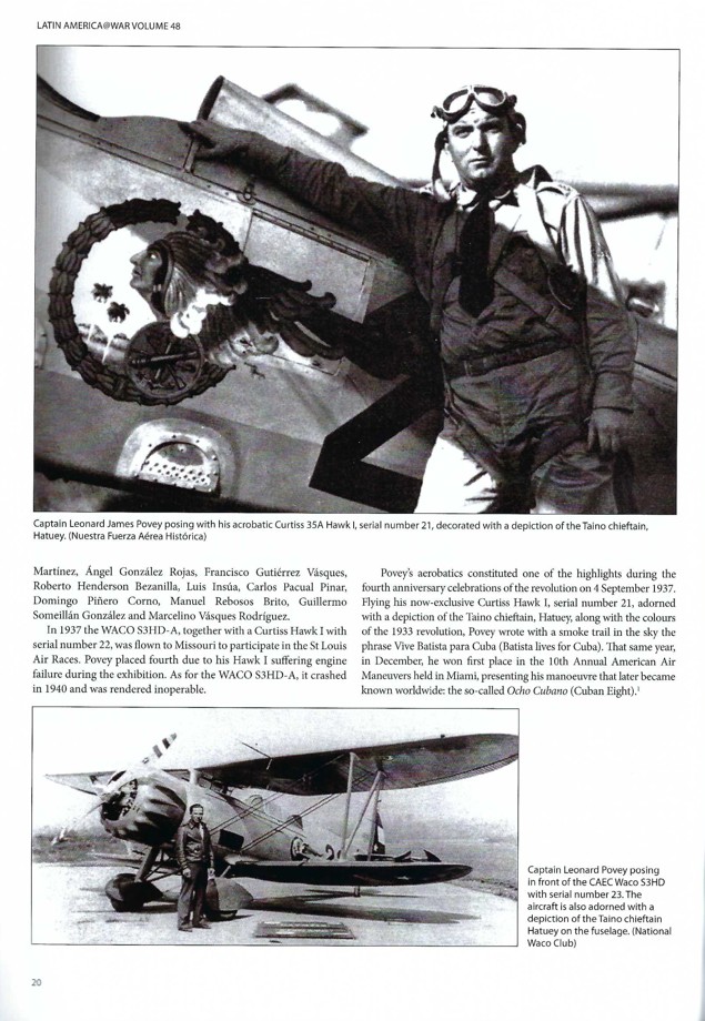 Captain Leonard James Povey was a critical part of Cuban aviation and can be seen on the front cover and on Page 20. The photograph at the top of the page depicts Povey posing in front of his Curtiss Model 35A Hawk I with a great view of the emblem bel ow the cockpit of Hatuey. The bottom of the page shows Povey standing in front of a Waco S3HD-A, also with the emblem of Hatuey. The Waco D series were military biplanes built in Troy, Ohio, [Home to a great museum] that were exported outside of the United States. The -A suffix indicated it was armed. This S3HD-A featured a 420 hp Pratt & Whitney Wasp Jr radial engine and two bomb racks [probably USAAC A-3] under the fuselage between the spatted landing gear. A .30-caliber Browning was on a flexible mount in the rear cockpit along with one forward firing Browning in the lower right-wing root. Povey would later become famous all over the world for his Cuban-Eight maneuver that earned him first place in the 10th Annual American Air Maneuvers held in Miami, Florida.