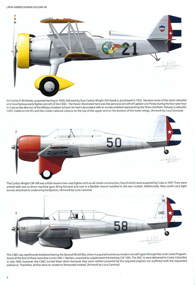 Three of Luca Canossa’s color side profiles can be found on Page 36ii. The top profile is Captain Leonard James Povey’s Curtiss Model 35A Hawk I. The center profile is one of five Curtiss-Wright CW-19R, a two-seat fighter powered by a Wright J-760 Whirlwind radial engine. The Cuban CW-19R carried a 30-caliber Browning on a flexible mount in the rear cockpit and one 30-caliber Browning in the engine cowling. Wing gun pods on each outer wing could be fitted. The color profile at the bottom of the page is a Curtiss SNC-1 Falcon fighter that was rejected by the CAEC [Cuerpo de Aviación del Ejército de Cuba]. The SNC-1 Falcons [CW-22], originally meant to supplement the CW-19R fighters were transferred to Venezuela instead.