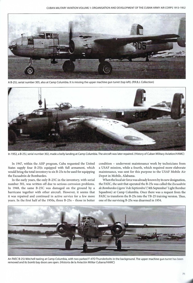 Cuba supported the Allies in World War II and post-war seeing modern aircraft integrated into their air force. This included the American Republics Program (ARP) and the Mutual Defense Assistance Program (MDAP). These included Grumman TBM Avengers, Lockheed P-38 Lightnings, Republic P-47 Thunderbolts, Consolidated PBY Catalinas, and North American B-25 Mitchells. Cuban B-25J Mitchells and P-47 Thunderbolts can be spotted on Page 71. The photograph at the middle of the page shows Cuban serial number 302, a B-25J [44-30348] that was acquired in 1947 under the auspices of ARP. Here she is shown after making a belly landing in 1952 at Camp Columbia. The B-25J at the top of the page is Cuban serial number 305, a B-25J [44-25848] that was also acquired in 1947 under ARP. Notable is that the dorsal turret has been deleted but she is still wearing her chin gun packs.