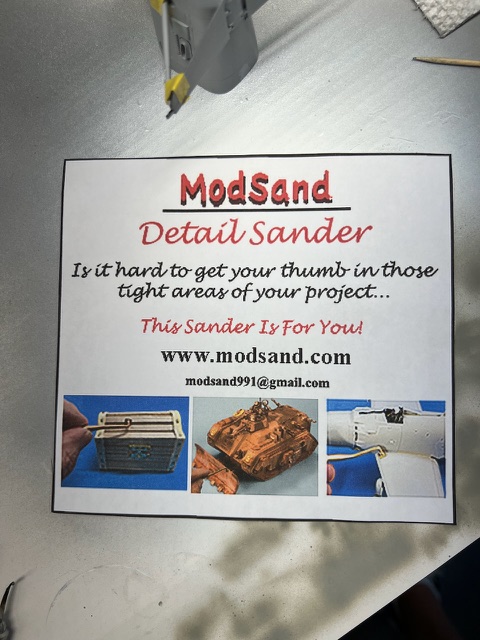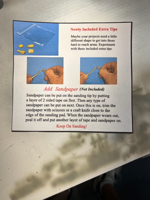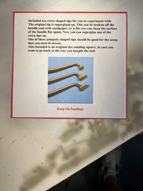 This handheld tool is designed to get into tight spaces like wing roots, intakes, or other tight or hard to reach spaces. It has four resin-like tips which are to be superglued to the tip of the tool, and sandpaper is to be attached to the tip with double-sided tape. I have to admit that at first this seemed like a pain to set up, but it is really very quick and easy. I tested the tip change out by removing the attached tip and prying it off with a hobby knife, and it came off cleanly and in one piece. I then glued on another tip, the one with the triangular point. I attached a small piece of sandpaper with double-sided tape, and then trimmed the sandpaper to match the tip with my hobby knife, and the sander was ready to use. As advertised, it works well in awkward spots like wing roots, as shown in the accompanying photos. I also find it useful in cleaning up areas to be glued where paint needs to be carefully removed.