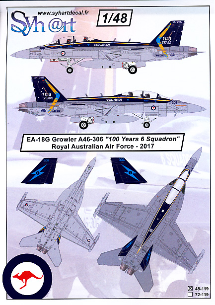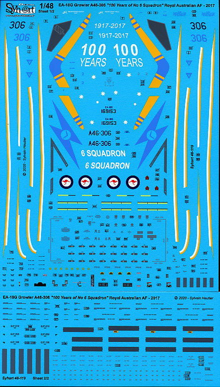 For the Centenary of 6 Squadron in 2017, one of these brand-new Growlers, A46-306, received a special scheme with night blue spine and fins, and with a large yellow boomerang, the insignia of the squadron for 100 years.