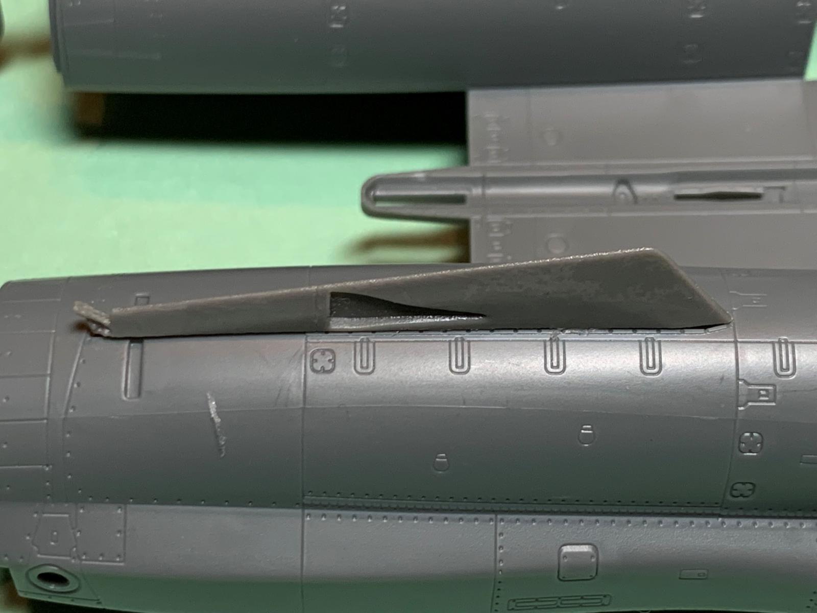 After separating the parts from the casting stubs, I soaked the fins in clean, soapy water to remove any casting residue or oil from the parts and then set them aside to dry. As a Tomcat addict, I always seem to have at least one F-14 kit under construction. This time it was an F-14B kit from Hasegawa. As Brengun’s parts are intended to be applicable to several different kits, the fins do not have any locating tabs or pins on them to assist in locating on the model. I used one of the Hasegawa fins to establish where the leading edge of the ventral fin was and marked that location in pencil. I then tacked the Brengun fin in place with white glue, taking care to ensure that the part covered the locating slot on the kit and that the fin was at the correct angle. Once the glue set up, I took a look at the fit and realized that I will either need to do some filing of the replacement part or filling around the base of the fin after it has been glued in place with superglue, as the mating surface of the fin is flat and straight, whereas the lower engine nacelle of the Tomcat has a slight curve upward as you go aft. The gap is not huge, so a little Mr. Surfacer should be all you need to fair the fin in.