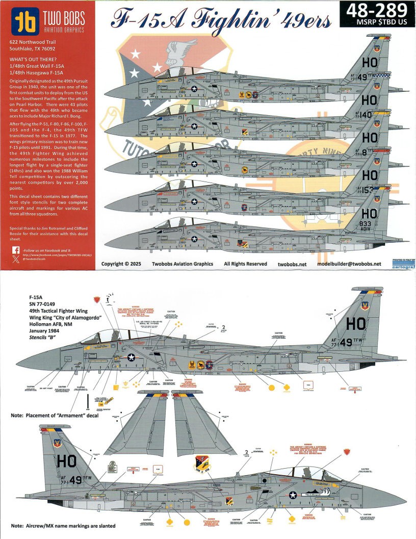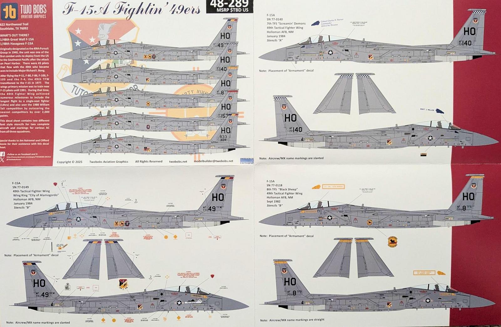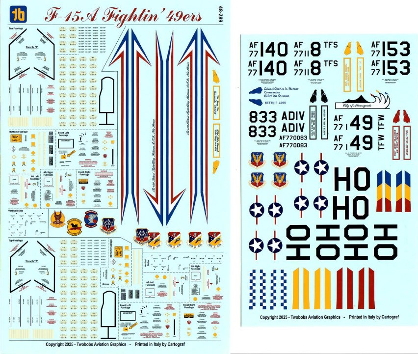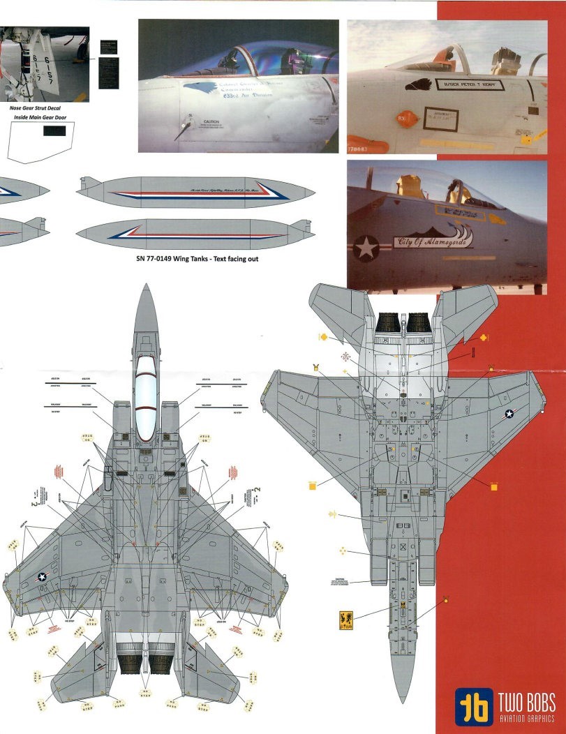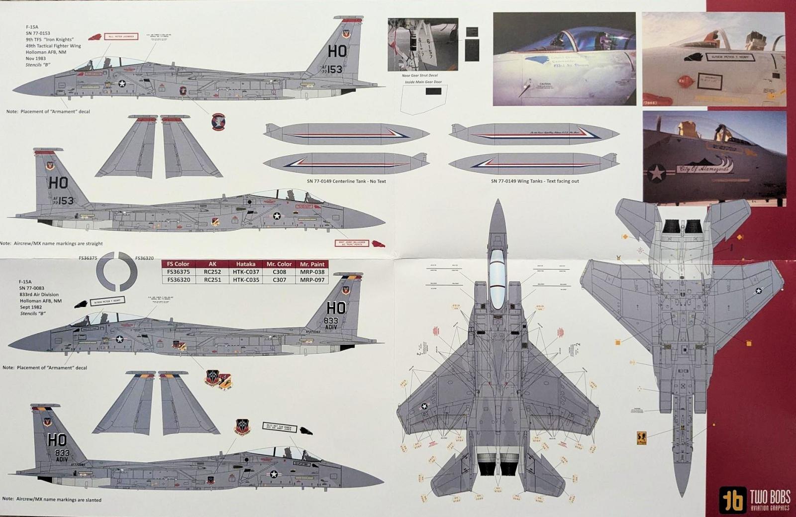 Two Bobs Aviation Graphics are well known for their attention to detail, color accuracy, instructions and graphics, and quality. This latest decal set is no exception. The F-15A Fightin’ 49ers decal set comes with two decal sheets in a protective Ziploc sleeve (6”x 10”) and one-page glossy color instructions (17”x11”) that folds into a four-page booklet.