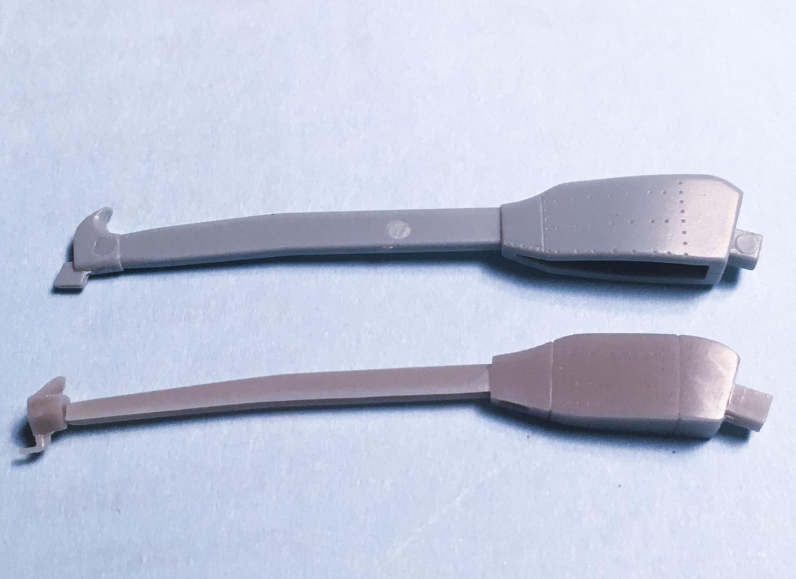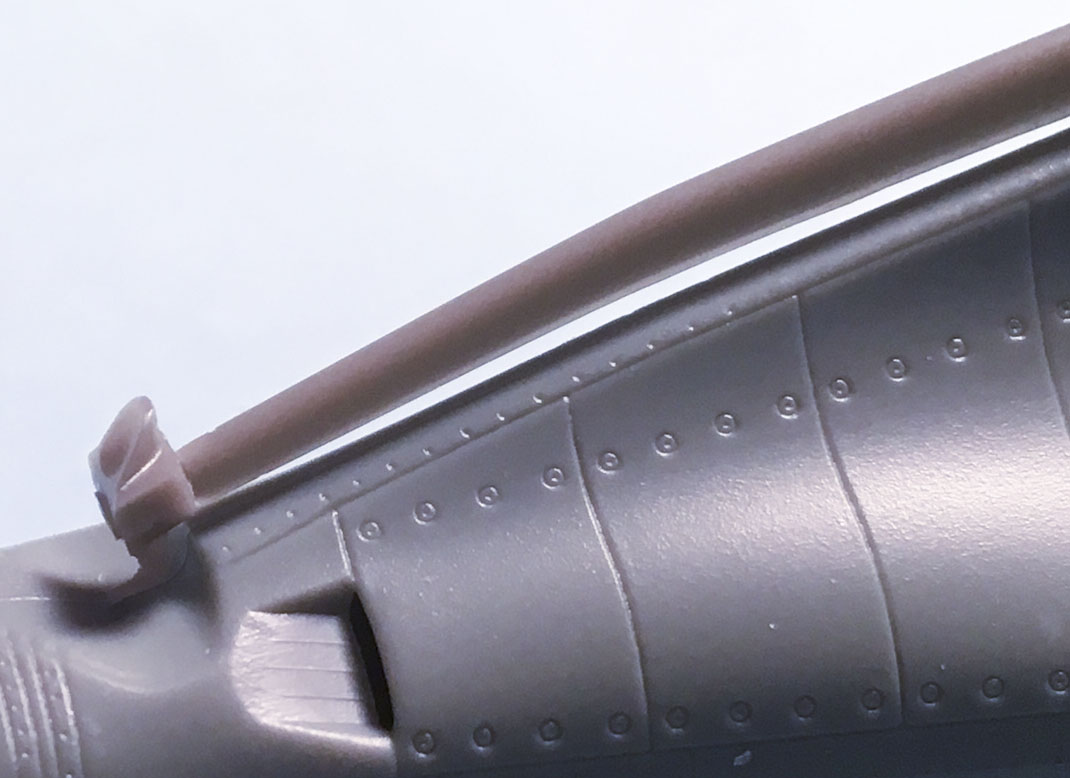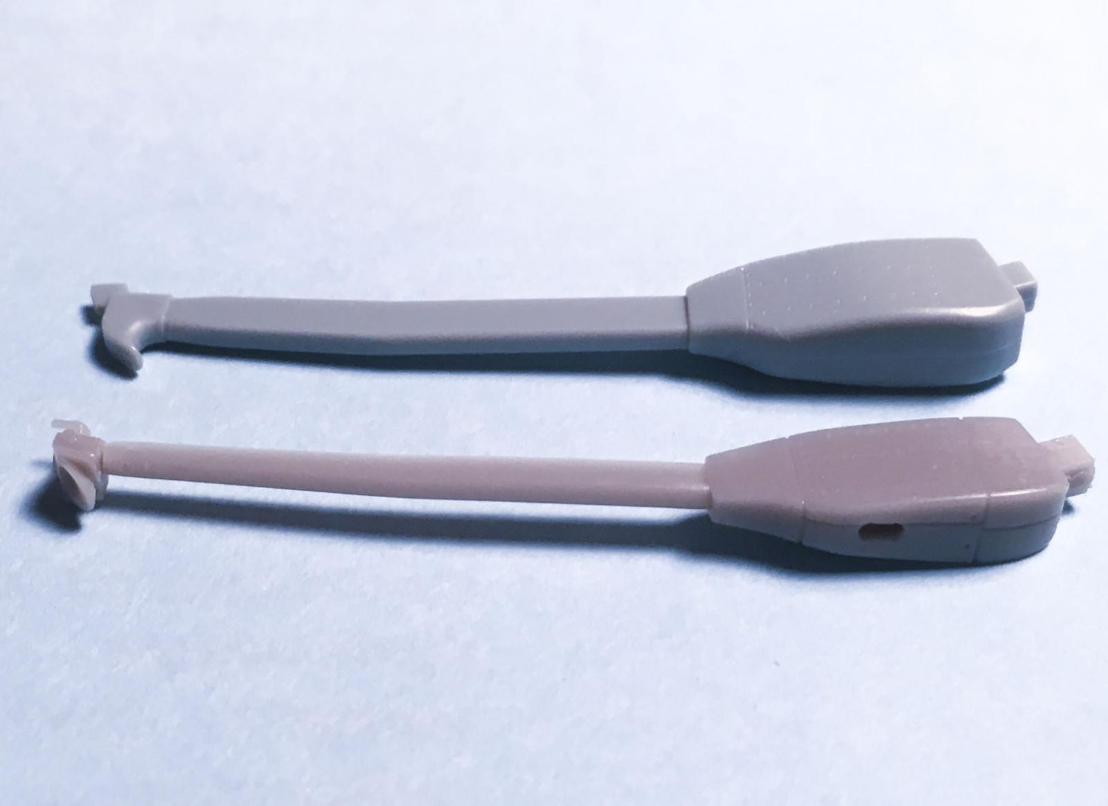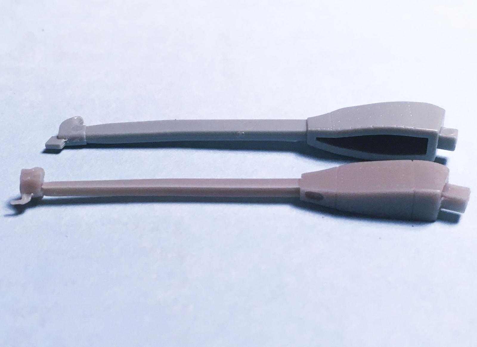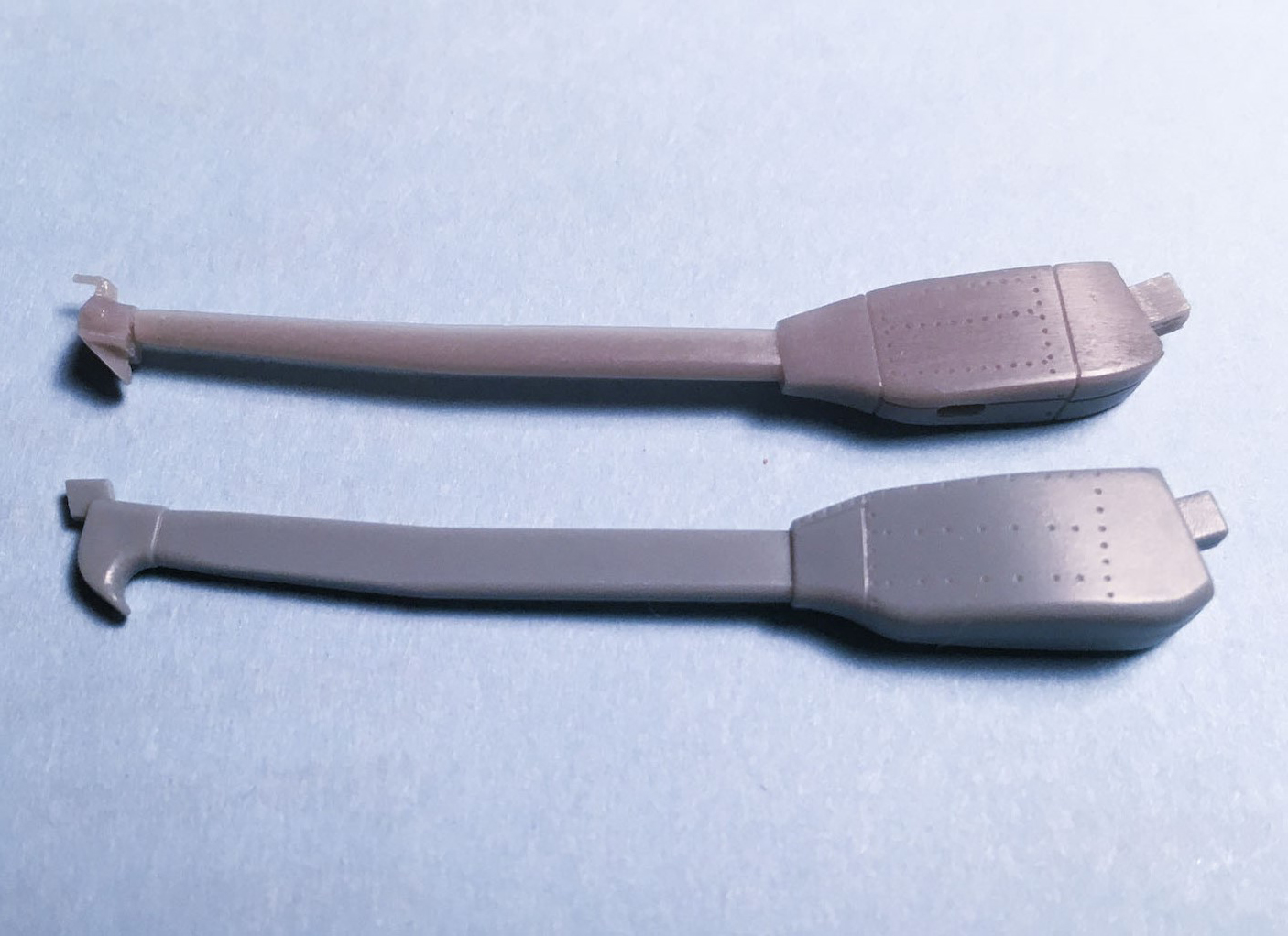 Quickboost has molded the arresting hook perfectly in light tan resin with no apparent bubbles. The Quickboost arresting hook is supplied as two parts on a single resin sprue with thin resin attachments to the parts that should minimize any cleanup. Although most paints will adhere to resin alone, I would recommend that you wash the parts to remove any remaining mold release and prime them first. They will need to be installed with your favorite CA (super glue) or epoxy, as the normal plastic glues or solvents will not react with the resin.
