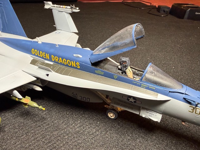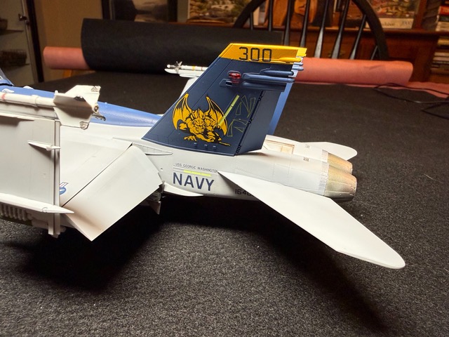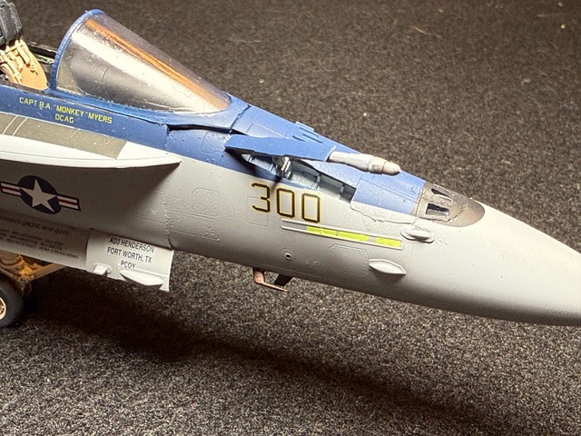 I strayed from either option and chose a Squadron sheet (#SQA 48003) with two F/A-18C featured a/c: VFA-192 CAG bird from the World Famous Golden Dragons or VFMA-122 Werewolves. Where the kit’s decals came into their own was in the huge number of small decals. While I used only a few of these, they were invaluable. An example was the tail hook stripes; without the kit decals it would have required careful masking and spraying the ever-present and prominent black stripes.