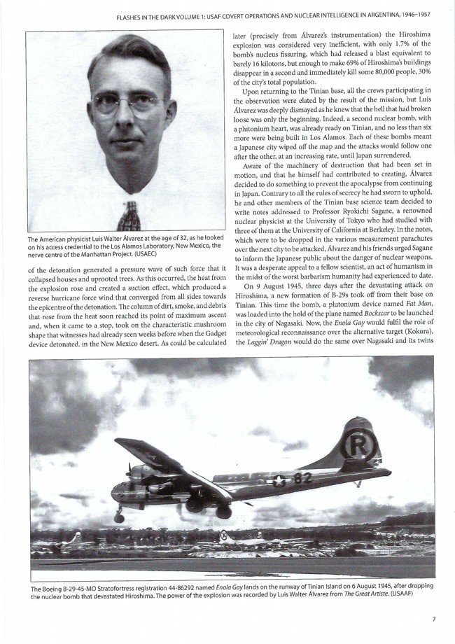 This first volume of Flashes in the Dark from Gustavo Marón kicks off with an introduction to American physicist Luis Walter Alvarez. Alvarez was born in San Francisco on June 13, 1911, and passed on September 1, 1988, in Berkeley, California. He was involved in many activities that led to advancements in radar, along with working with Robert Oppenheimer in early fusion studies. He was part of the design team for the plutonium bomb “Fat Man” and flew in the Silver Plate B-29 “The Great Artiste” to observe and measure the blast of both nuclear bombs dropped on Japan. Enola Gay is shown landing on Tinian Island on Page 07 on August 6, 1945, after dropping the Hiroshima nuclear bomb. Luis Walter Alvarez is shown at the top of the page from his access badge to the Los Alamos Laboratory in New Mexico. His involvement in the Manhattan Project led to his discovery of xenon-133 and krypton-85 in tracking nuclear activities through air sampling. This air sampling became key in determining the progress the Soviet Union was making towards nuclear bombs.