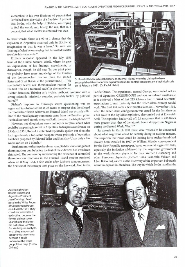 Several US aircraft, including the Boeing B-29 were converted to “weather” versions to accomplish this air sampling. Converted B-29 Superfortresses to the WB-29 configuration became key in radioactive tracking missions through the US AFOAT-1 [Air Force Office of Atomic Energy] program. This became key in Argentina when Austrian physicist Ronald Richter convinced Argentine President, Juan Domingo Peron, that he was able to control fusion experiments in 1948. A reactor was built on Huemul Island, and a public announcement was made that controlled nuclear fusion had been achieved on March 24, 1951, by President Peron as depicted at the bottom of Page 29. A photograph of Richter in his laboratory on Huemul Island is shown at the top of Page 29. This, of course, shocked the atomic physicists of the world that Argentina had become a nuclear power. The AFOAT-1 WB-29s had already been flying over Huemul Island, monitoring the “weather” and knew ahead of time before the world’s scientists claimed fraud.