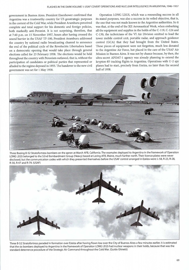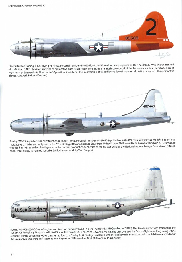 Three color side profiles can be found on Page 44ii. The top profile by Luca Canossa is of a QB-17G drone that was used to sample radioactive particles from the Zebra nuclear test mushroom cloud. QB-17G drones were piloted by a ground operator for taxi and takeoff operations before control was turned over to a DB-17G director for aerial operations. All armament had been removed, and a filter box was located right behind the cockpit. The last of three nuclear tests in 1948 under Operation Sandstone, Zebra was executed on May 14, 1948, at Enewetak Atoll in the Marshall Islands. The Mark 3 bomb yielded 18 kilotons with a uranium core that was only 10% of the U-235 of Little Boy. Optimal results from this test saw the immediate production for the Mark 4 bomb, the first practical piece of ordnance and the first mass-produced nuclear bomb. The center profile by Tom Cooper is one of the Boeing WB-29 Superfortress that was active over Huemul Island collecting intelligence on Ronald Richter’s activities. Based at Hickam AFB in Hawaii, she served with the 57th Reconnaissance Squadron. The Tom Cooper color side profile of the Boeing KC-97G-105-BO, s/n 52-889, at the bottom of Page 44ii was one of four that was deployed under Operation Long Legs. This KC -97G provided re-fueling for B-47 and B-52 bombers that were in the skies over Argentina during Aeronautical Week in 1957. Instituted in Argentina in 1945, these annual series of airshows provided a showcase for US Airpower. Three of the six Boeing B-52 Stratofortress bombers over Ezeiza can be spotted on Page 69. Gustavo Marón notes that it was standard practice of the Strategic Air Command at the time to be loaded with nuclear weapons in their bomb bays.