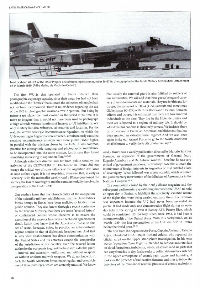 Two of the Lockheed WU-2As of the HASP Project can be seen at the top of Page 82. 56-6716 details have been noted above in the discussion of the rear cover profile. They were at the Tandil Military Aeronautical Detachment [Buenos Aires Province, Argentina] on March 24, 1959. At this date, these two WU-2As had yet to be modified with the nose collection ‘bottles’. An opposition weekly, Azul y Blanco, created a scandal that led to the USAF displaying the WU-2As in public to emphasize their ‘scientific nature’ to study weather. Tandil Air Base remains an active military air base. The sections include: