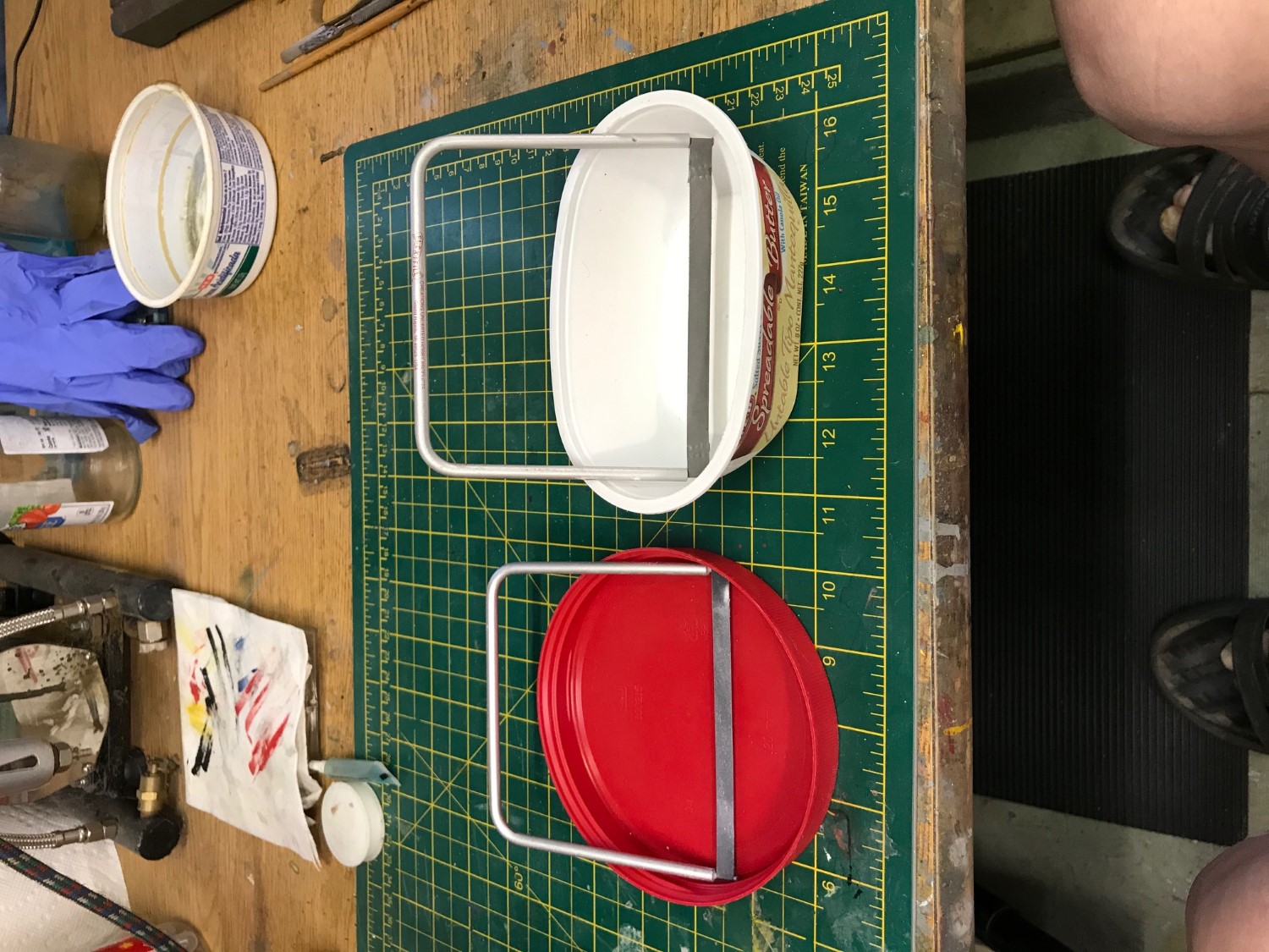 Mentioned earlier, the tape and pads can be used for wet sanding as well as dry sanding, and I will conclude this review with a “helpful hint”. There are a pair of items that can hold water into which the frame and tape will easily fit. The red jar lid in the accompanying image is just a bit wider than the span of the frame, and when filled with water, it is deep enough to “wet” the entire tape. The margarine container is not long enough at the bottom to accommodate the frame and tape, but when filled with water the tape can be totally submerged without difficulty.