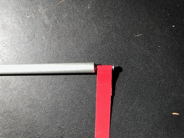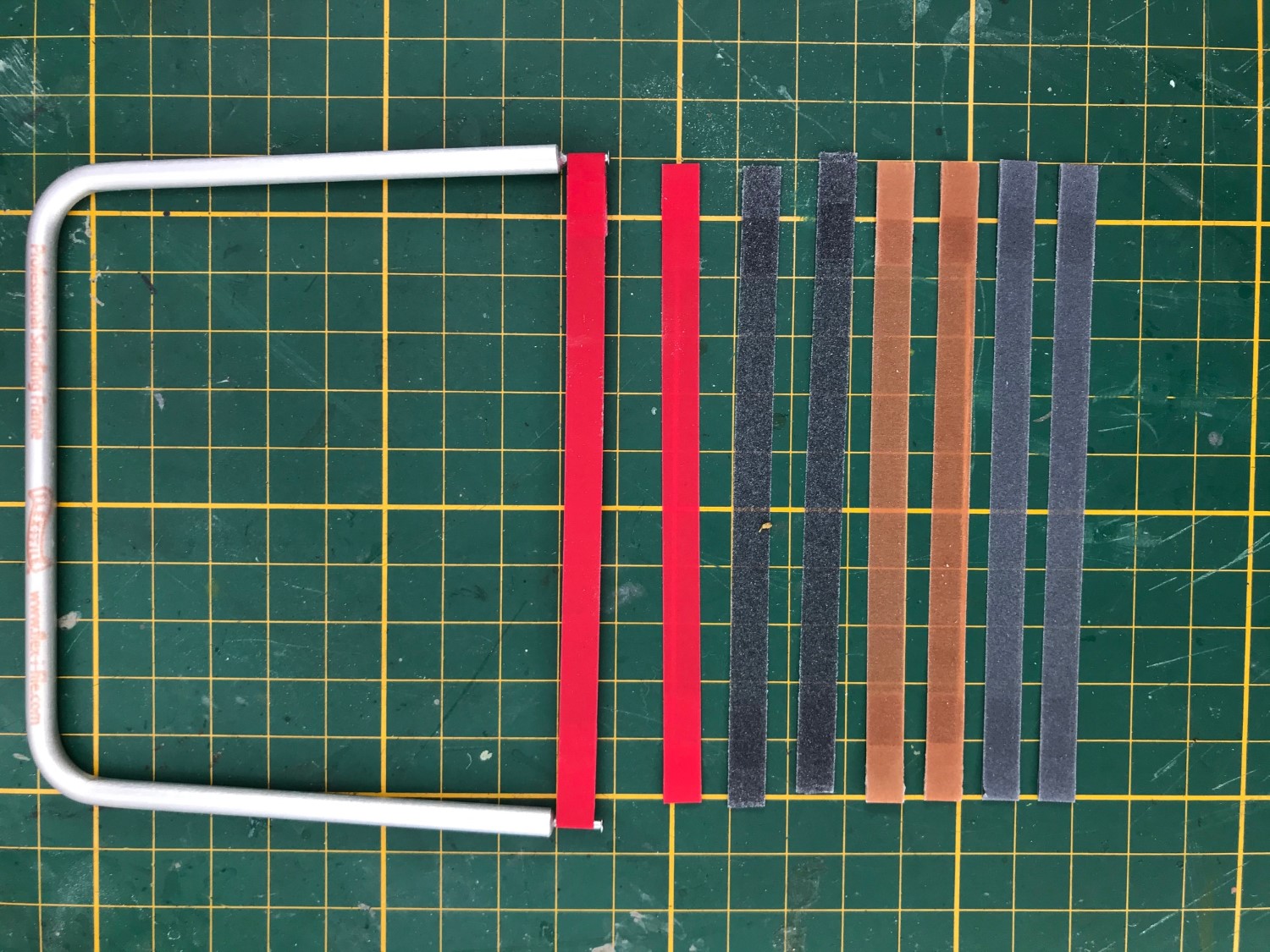 - The abrasive tape has grit on only one side and is 3/10” wide with a length that exceeds the span of the frame by about an inch. Both ends of the tape are folded back onto the non-grit side of the tape and the overlap is attached to the backside of the tape with an adhesive that is very durable. A small opening is left so that the pins on each end of the frame can hold the tape tightly. The tape and frame have enough “slack” to allow the tape to fit around curved surfaces while sanding, which the modeler will find beneficial.