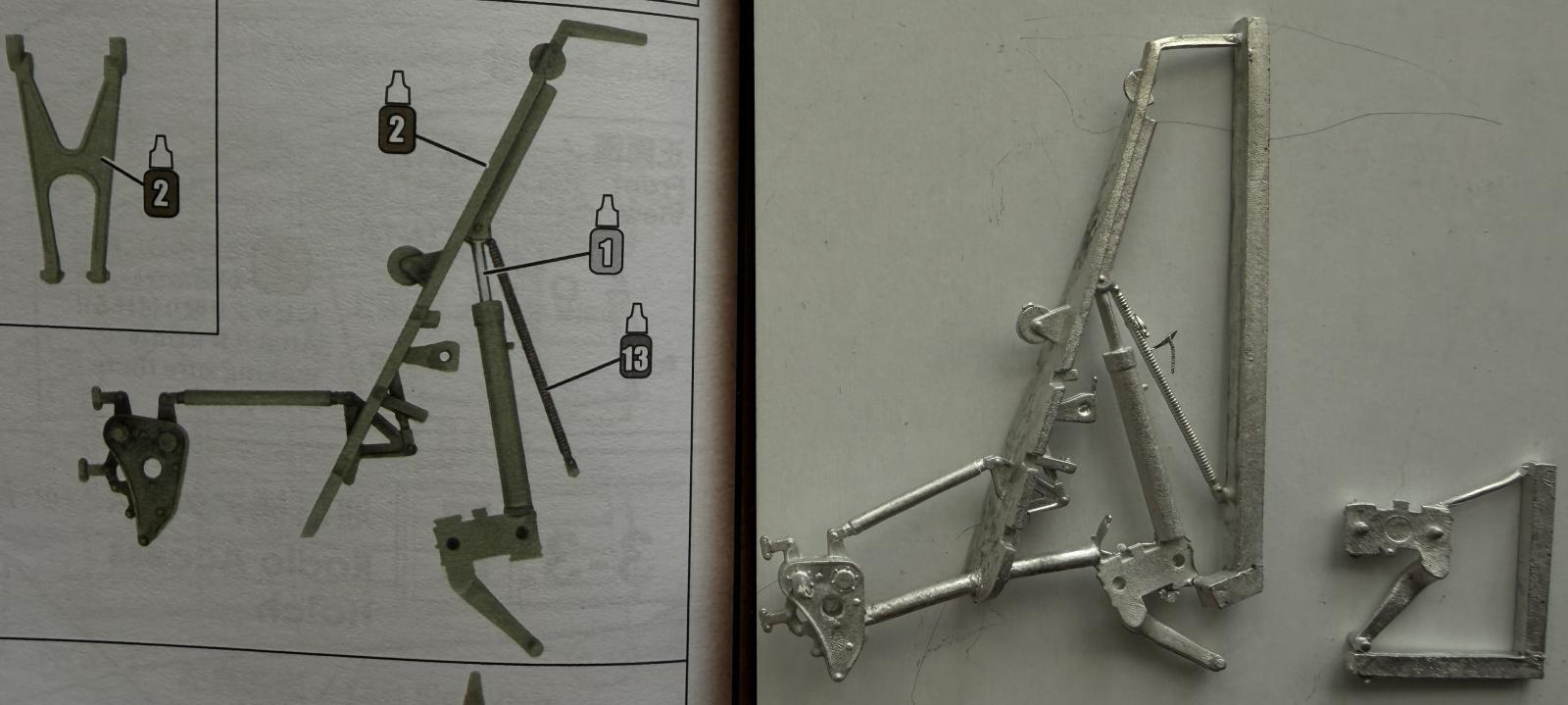 This product comes in a small blister pack and contains 10 elements, all made of white metal. There are no instructions included in the set, but it is easy to follow kit instructions to see how the parts are supposed to be configured. The manufacturer’s website has a section that provides a short guideline on how to use the white metal parts. What I found quite helpful is the presence of two landing gear sets: one with an imitation of a rubber piece covering the telescopic arm (lower strut) of the landing gear and one without it. There is only one set of torque links, though. The package also has a rear landing gear set that one of its parts must be glued and another detached and attached to the kit using the kit’s instructions for guidance.
