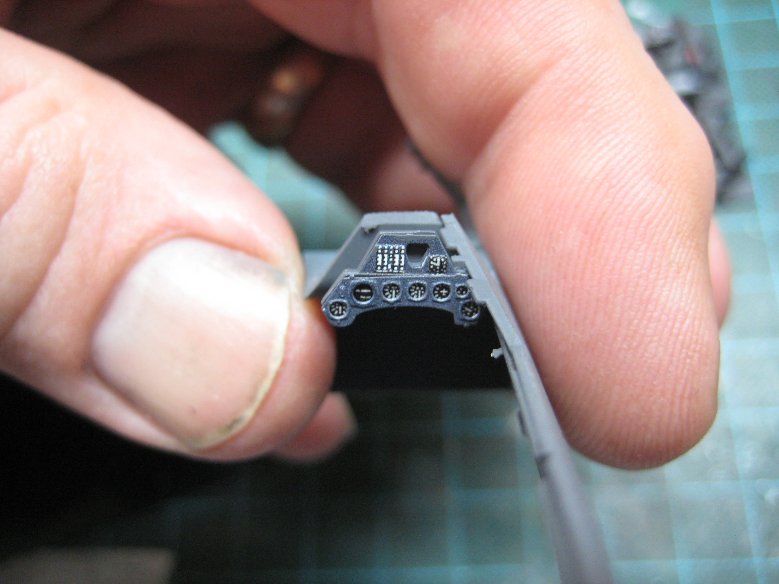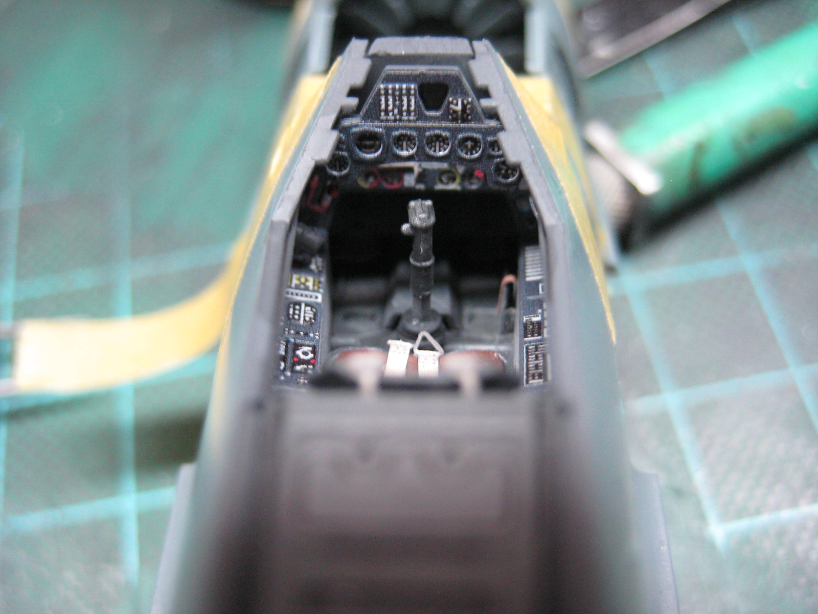 I paint my cockpit whatever color you like, I use Tamiya Dark Grey, then I weather the cockpit with a wash of Lamp Black artist oils. After that is dry I use a dry brush of RLM 02 and Model Master Magnesium to give it a metal look. Silver pencil and a sponge with the magnesium are used for chipping the interior paint. Then I add the pre-painted stuff. Then I add the seatbelts and drape them in a realistic fashion. A quick coat of Alclad Flat blends it all together. Some touch up may be required for the metallic look, but not too much. Then I take Microscale Krystal Kleer and put a drop into each instrument face. This replicates the glass in the gauge. And that is how to add these parts to the model.