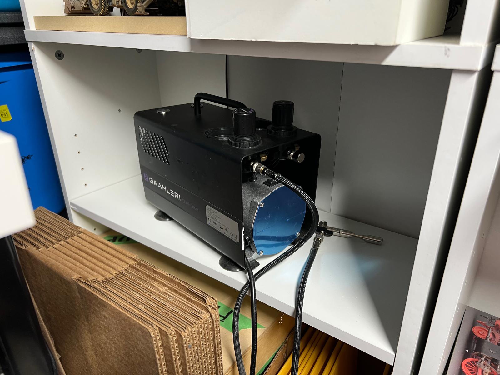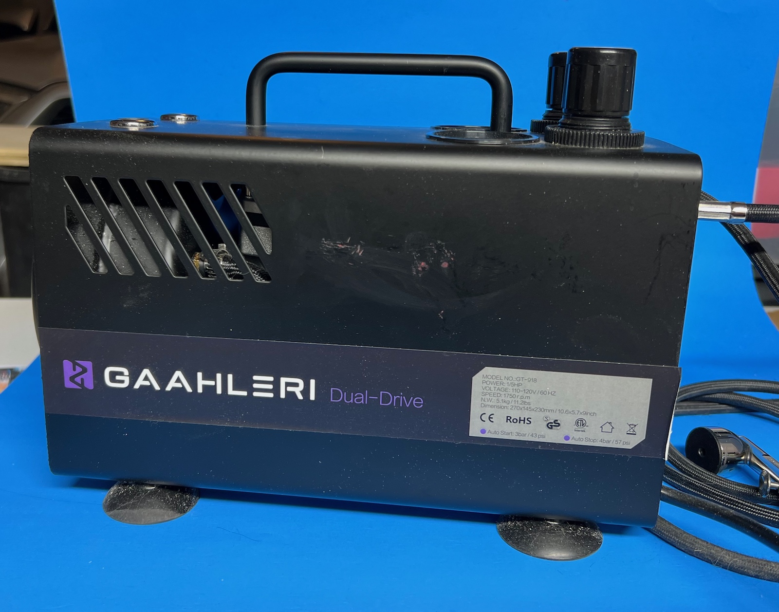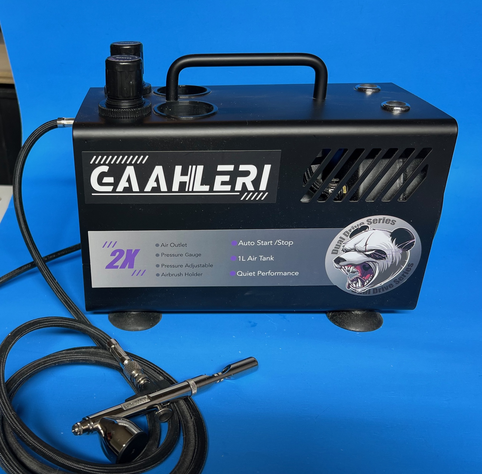 The Gaahleri GT-918 is a nice, compact air compressor that operates quietly, yet has enough power for two airbrushes. Two airbrush connections are provided with separate pressure meters for each connection. Pressure adjustments are easy with a push/pull knob that locks in the set pressure. Gaahleri lists the noise level for the compressor at 47 DBA maximum, which compares to a quiet home space and is not objectionable at all when running.