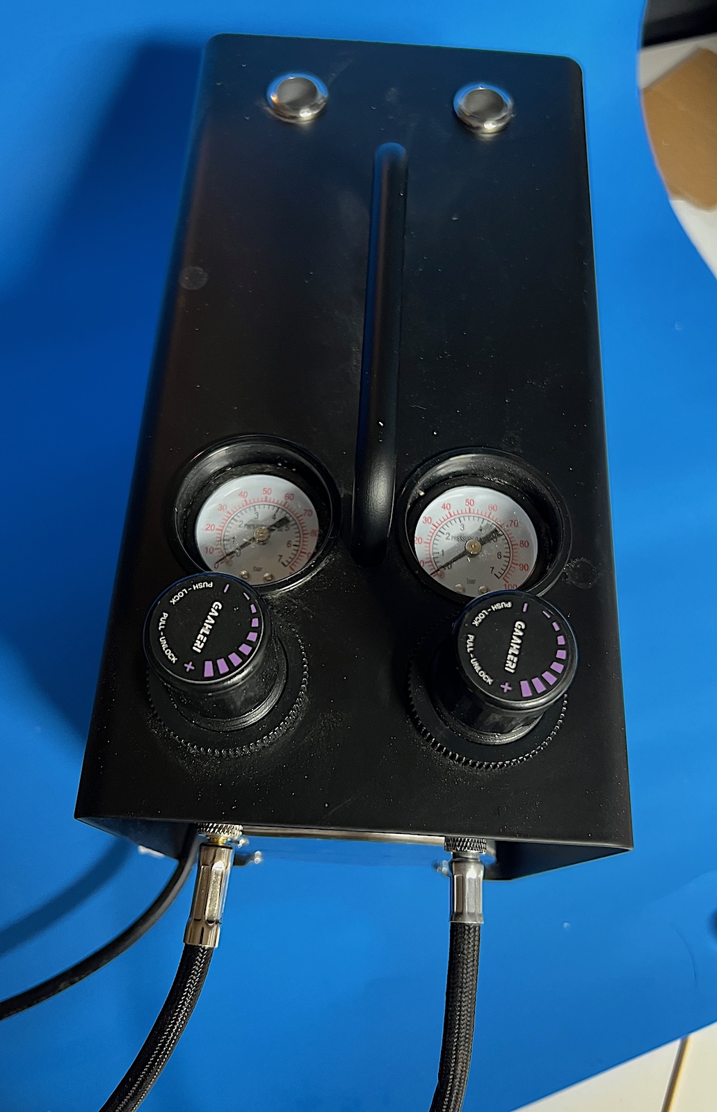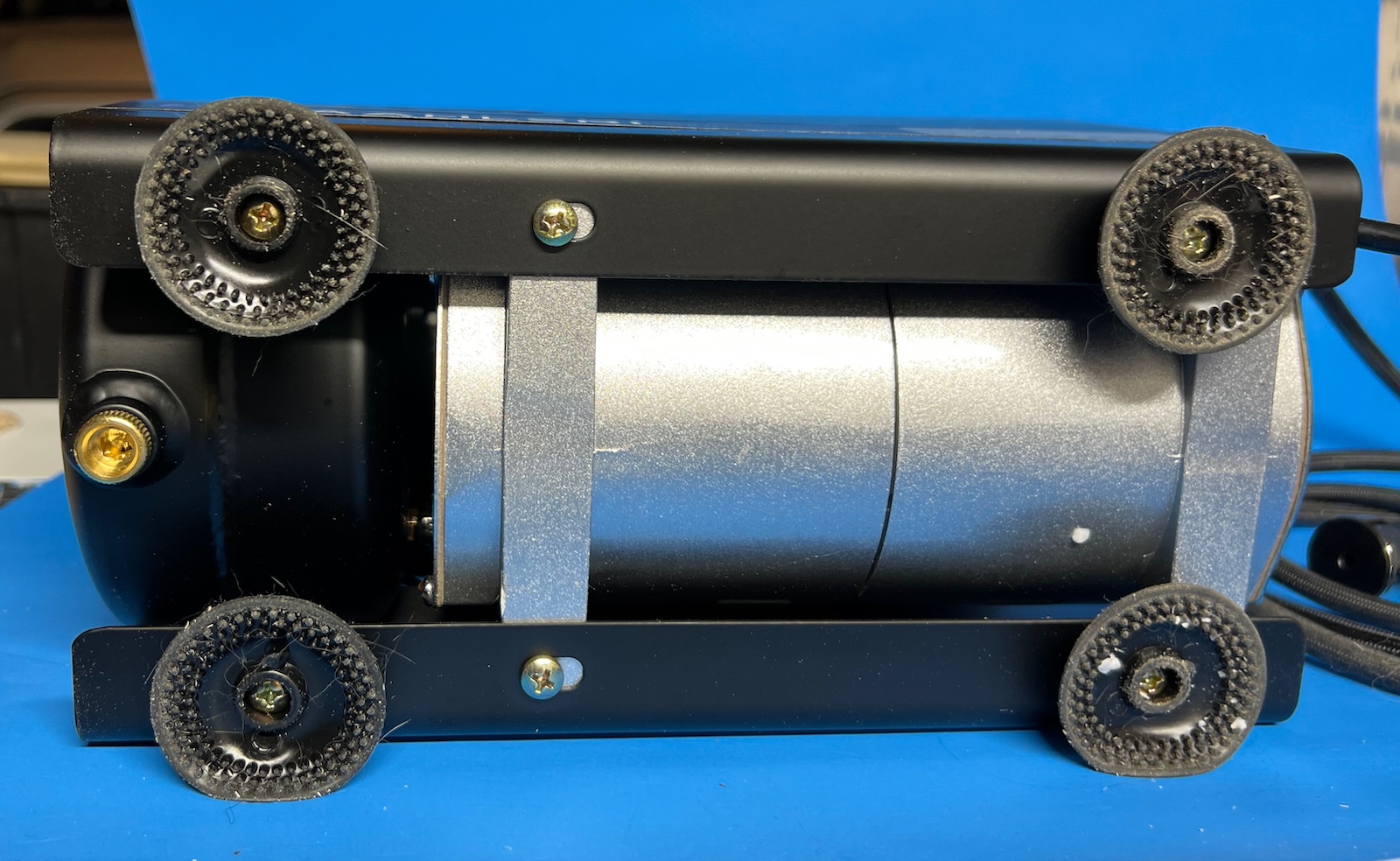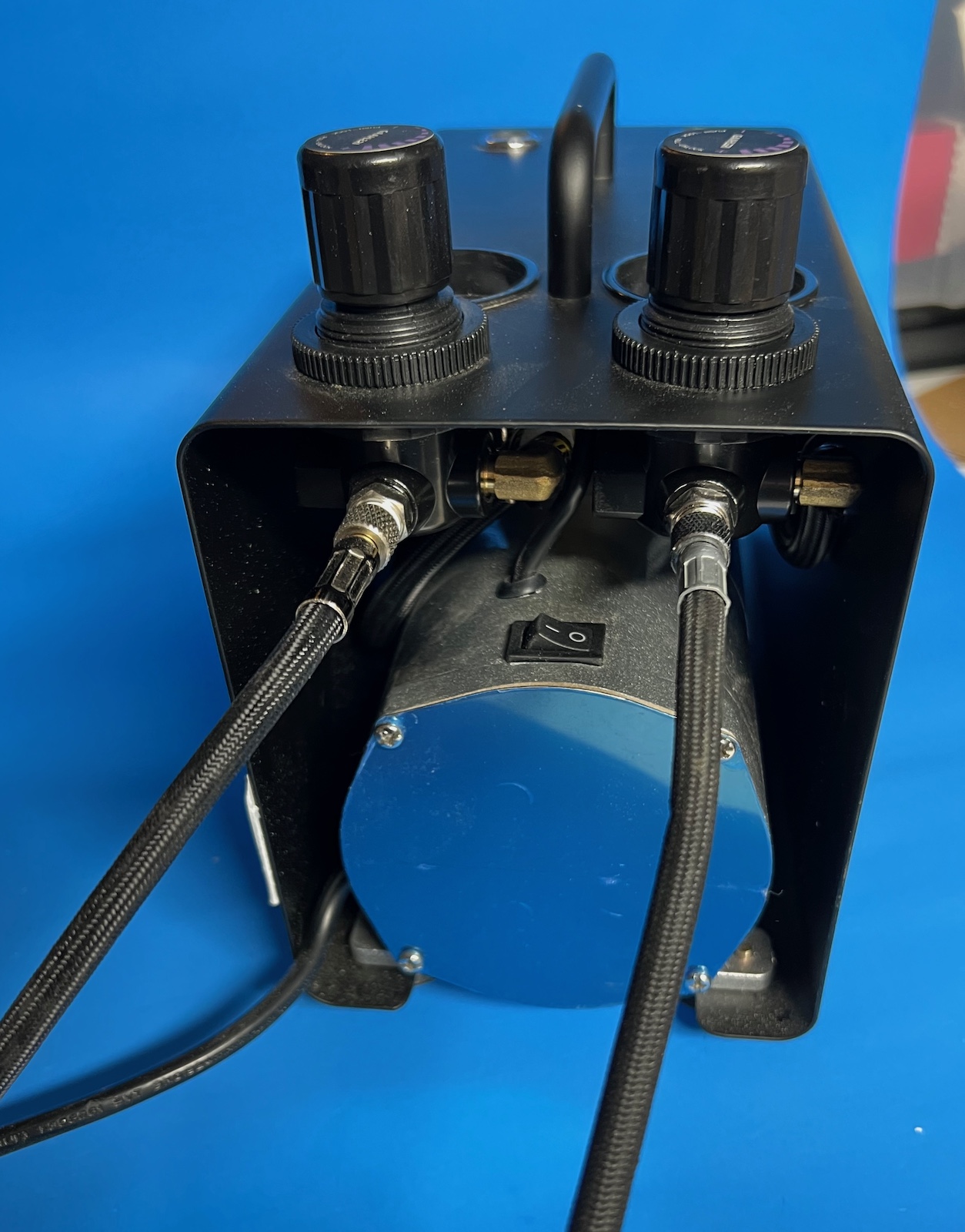 The Gaahleri GT-918 is a nice, compact air compressor that operates quietly, yet has enough power for two airbrushes. Two airbrush connections are provided with separate pressure meters for each connection. Pressure adjustments are easy with a push/pull knob that locks in the set pressure. Gaahleri lists the noise level for the compressor at 47 DBA maximum, which compares to a quiet home space and is not objectionable at all when running.