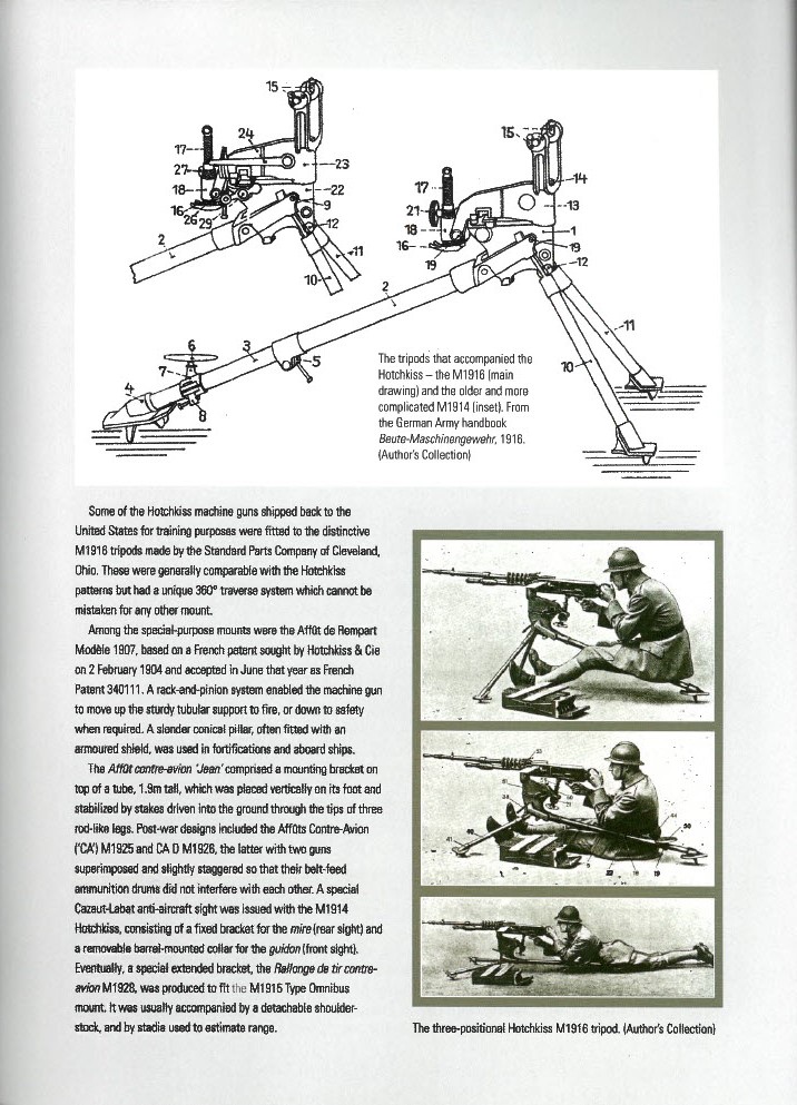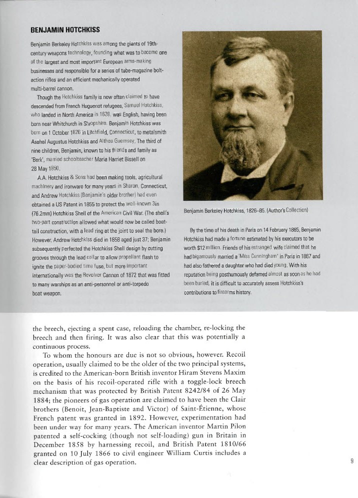John Walter kicks off the introduction with a background on machine guns and the environments that led American Benjamin Hotchkiss to his manufacturing facility in 1867 in France. Benjamin Hotchkiss’ revolving cannon was a competitor to the Gatling gun and was quite successful. Although Benjamin would pass in 1885, his company lived on, and acquired the rights to Bohemian Adolf Odkolek’s gas-actuated machine gun. The Maxim machine gun was dominant at the time, but required water cooling. The new Hotchkiss machine gun was air-cooled, making it easier to move. Widely used in WWI by the French, British, and Americans (the Americans referred to it as the Benét-Mercié), the Hotchkiss also found homes in many countries such as Sweden, Norway, Spain, and notably in Japan. The Russo-Japanese War showed the world the power of the machine gun as the Russian Maxims faced the Japanese Hotchkiss machine guns. Japan would continue to develop the Hotchkiss design and use them extensively in WWII. Chinese copies were used in the Korean War, in the French Indochina War, and the Vietnam War. A Turkish Hotchkiss machine gun was recovered in Afghanistan in 2016. The contents include: