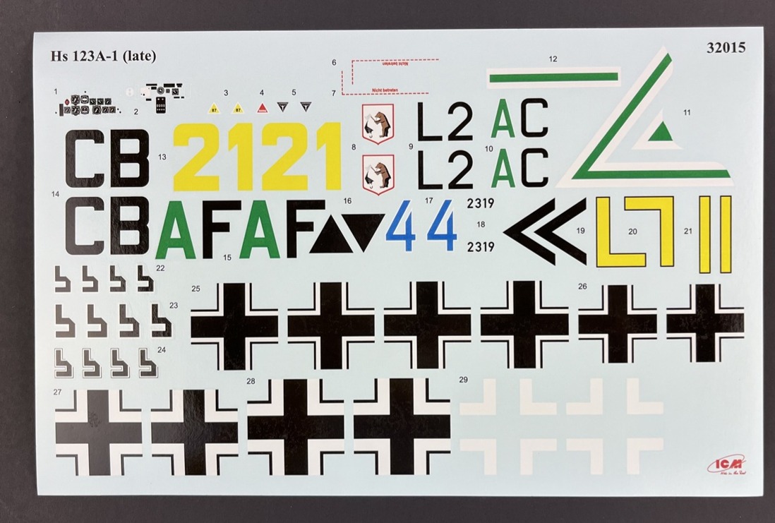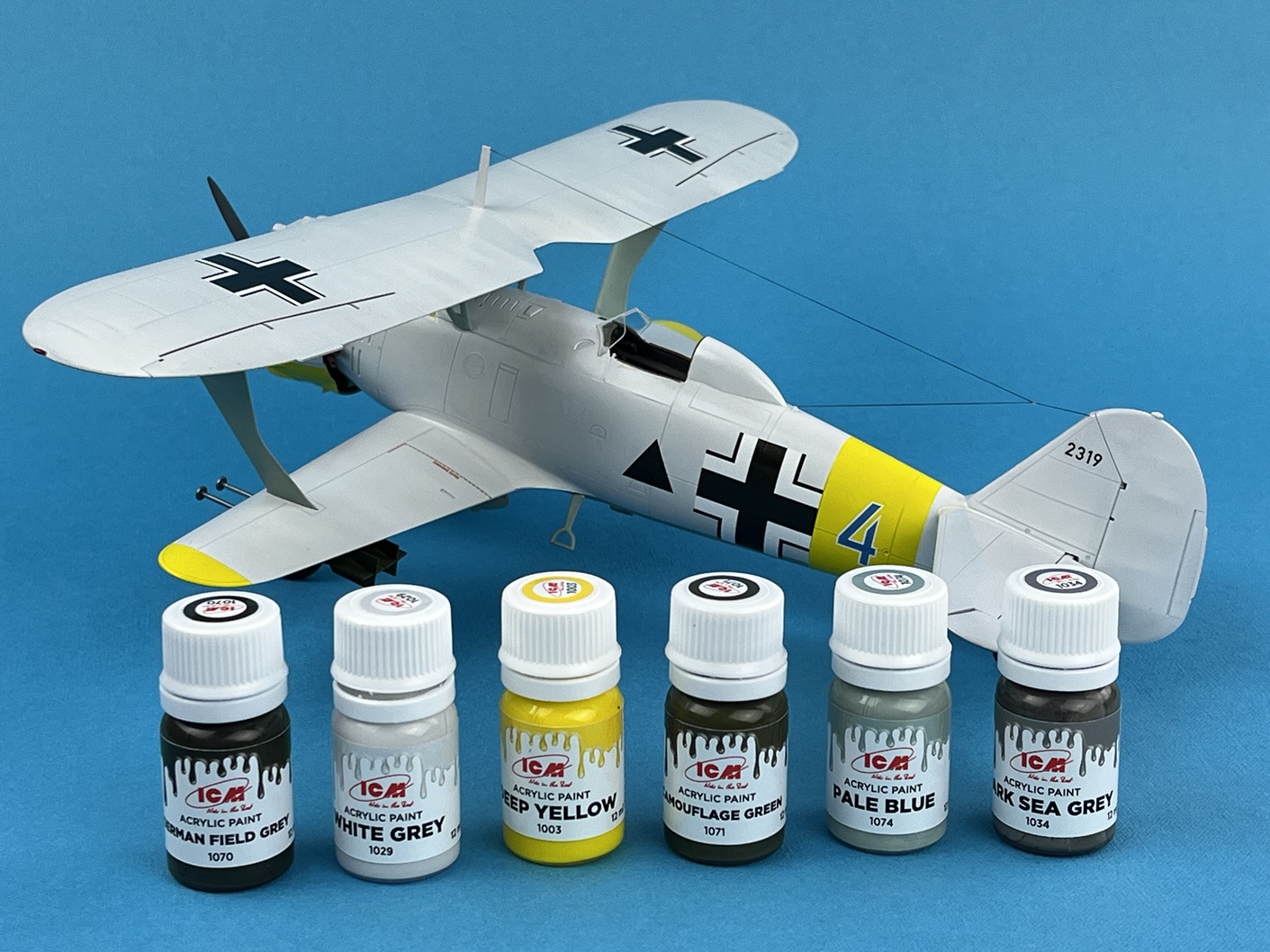 ICM also provided a paint set (Item 3095 Luftwaffe Assault Aviation) along with the kit and I tried to use these paints in my build whenever possible. Other IPMS reviewers have commented on the quality of these paints, and I agree they work well hand brushed or airbrushed, except for the White Grey (1029) which requires a white primer coat or more than one coat to get full coverage. I was apprehensive about using such small quantities of paint for large surface areas of a kit in 1/32 scale, but I needn’t have worried, as there was plenty of paint, even when I had to make touch-ups and paint over my mistakes.