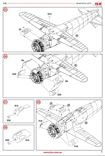 In steps 37 and 38 the bezel covering the hole for the machine gun bullets to pass through is erroneously listed as E20. It is actually F20. Also, this is a good time to mention that once these parts are glued into place, a hole can be drilled through the cowling parts E13 and E14 with a number 51 drill bit to add realism. The cowling in this kit has posed a problem for several modelers, and I can offer some advice to make your efforts a little more fruitful. Since the detailed engine has realistic valve covers, two per each cylinder, these are nice if you plan to build your plane with the cowling removed for engine maintenance. But when assembling cowling pieces over the engine, they interfere with the fit. Cutting them off is best done before mounting the engine and exhausts to the front of the fuselage, in order to avoid breaking or damaging the other assemblies. Removing these valve covers cannot be seen on the completed model. A brief note about the exhaust parts G37 and G31. They need to be mounted as close to the fuselage as possible, otherwise they will interfere with the fit of E29 and E30. In step 35 the bottom of the cowling (E5) mounts to the engine ring as well as the carburetor intake, and a solid placement will make the rest of your cowling assembly process much more satisfying. In my experience, the engine ring which the front of each cowling piece mounts to was not as important as I thought. You are better off to make certain that each successive section of the cowling (parts E4, E6, E-29, E30 and finally F10’s and E13, E14) mates well with the previously mounted and glued part. It is best to allow time to ensure the glue has set before adding the next piece in this puzzle since any shifting will throw off the entire finished product. In my case, I had to muscle and clamp the final connection until the glue set since I had 1/8 inch gap to resolve. Follow my advice and you will be pleased with the final result.
