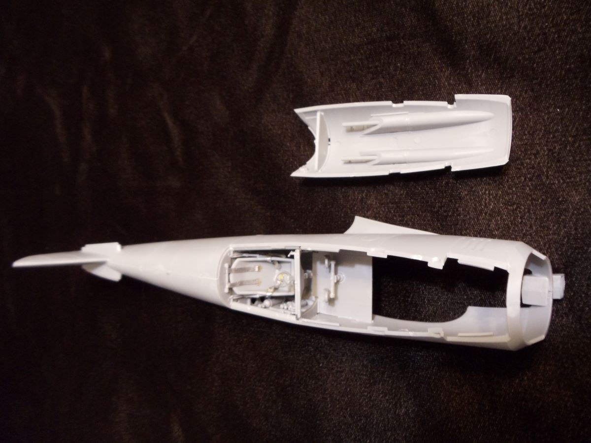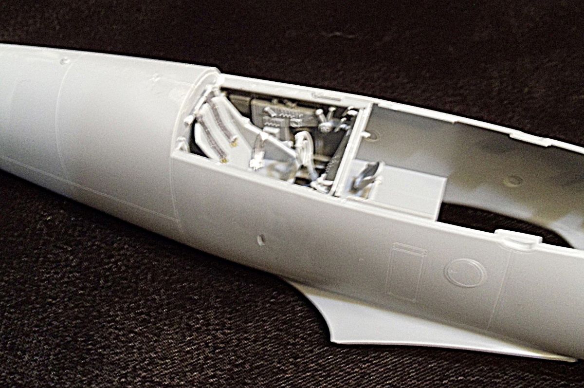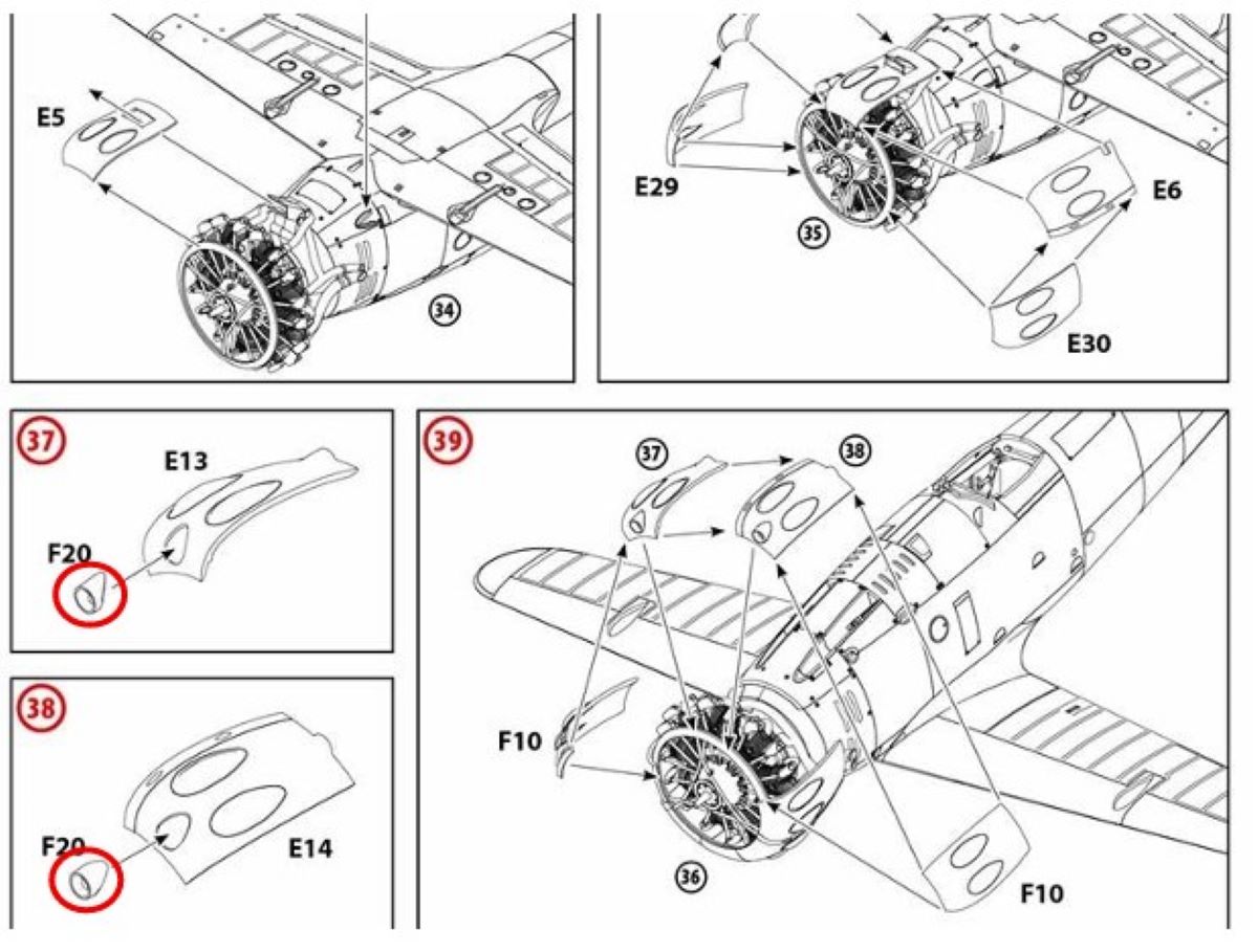 Next up is the highly detailed engine. The last part of this subassembly includes the exhaust pipes, which partially tie in to an oil cooler slung under the fuselage. As I wanted to simplify my masking challenge, I opted to add these very carefully but not actually glue them into the oil cooler, so that I could deal with the engine cowl separately from the fuselage. The last stage of this section was the cowl assembly itself, consisting of nine separate pieces so as to accurately model the cowl bumps in detail. Although you can leave some of these off to display the engine, I opted to do the full assembly, which required some very careful fitting to keep putty work down to a low roar. Actually, I was pleased to discover that despite the number of parts, it all fit together very well, so only a dab was required. However, the gun trough add-ons (F20) were molded solid, so I found it useful to drill them out. Otherwise, everything went according to the instructions.