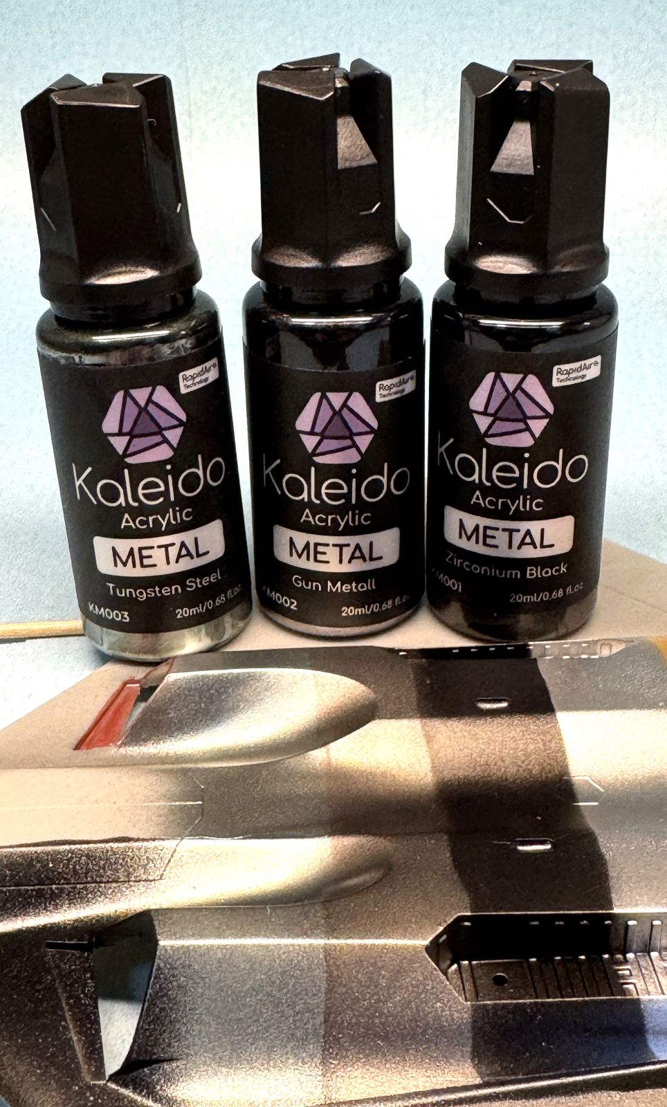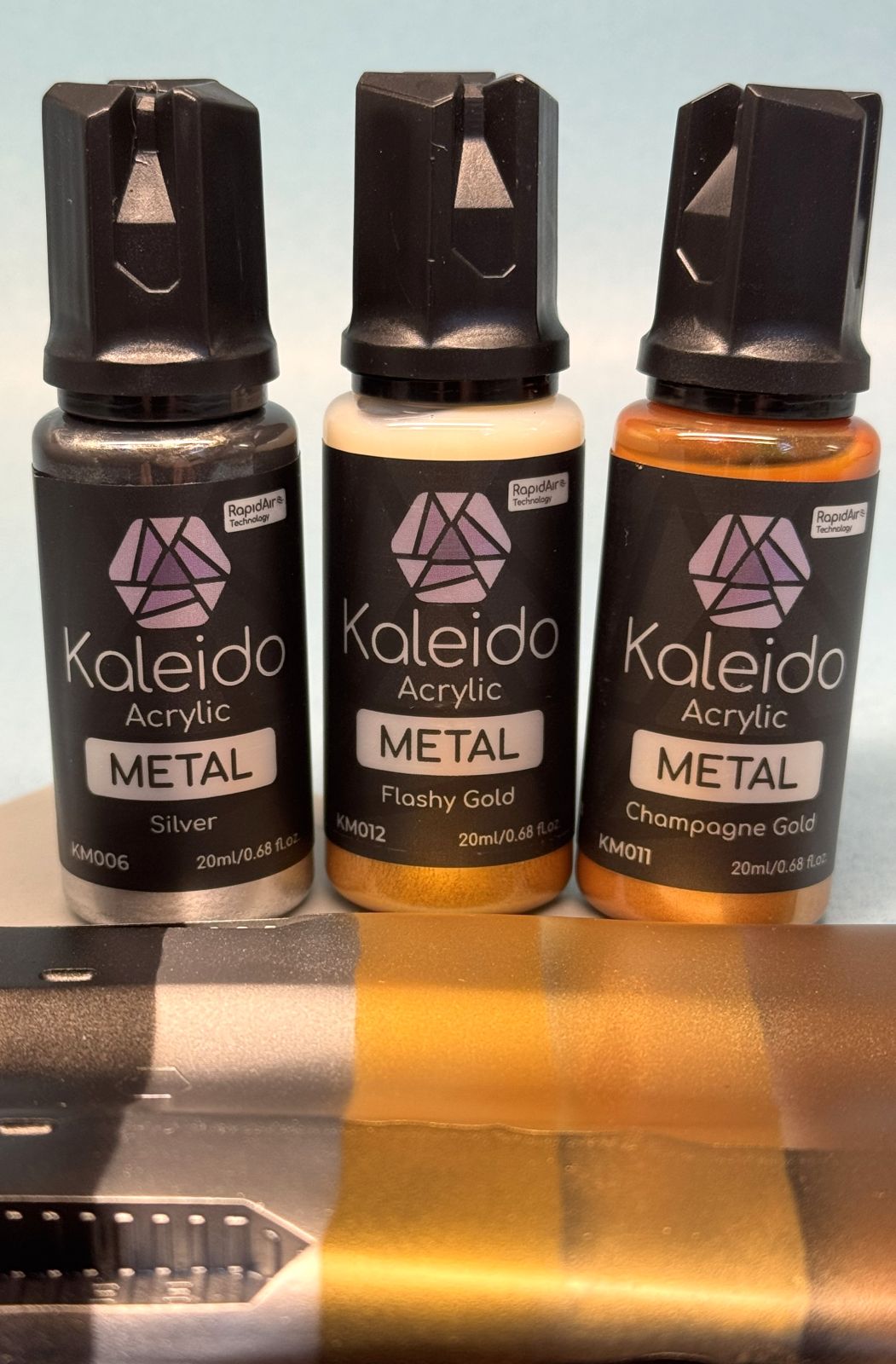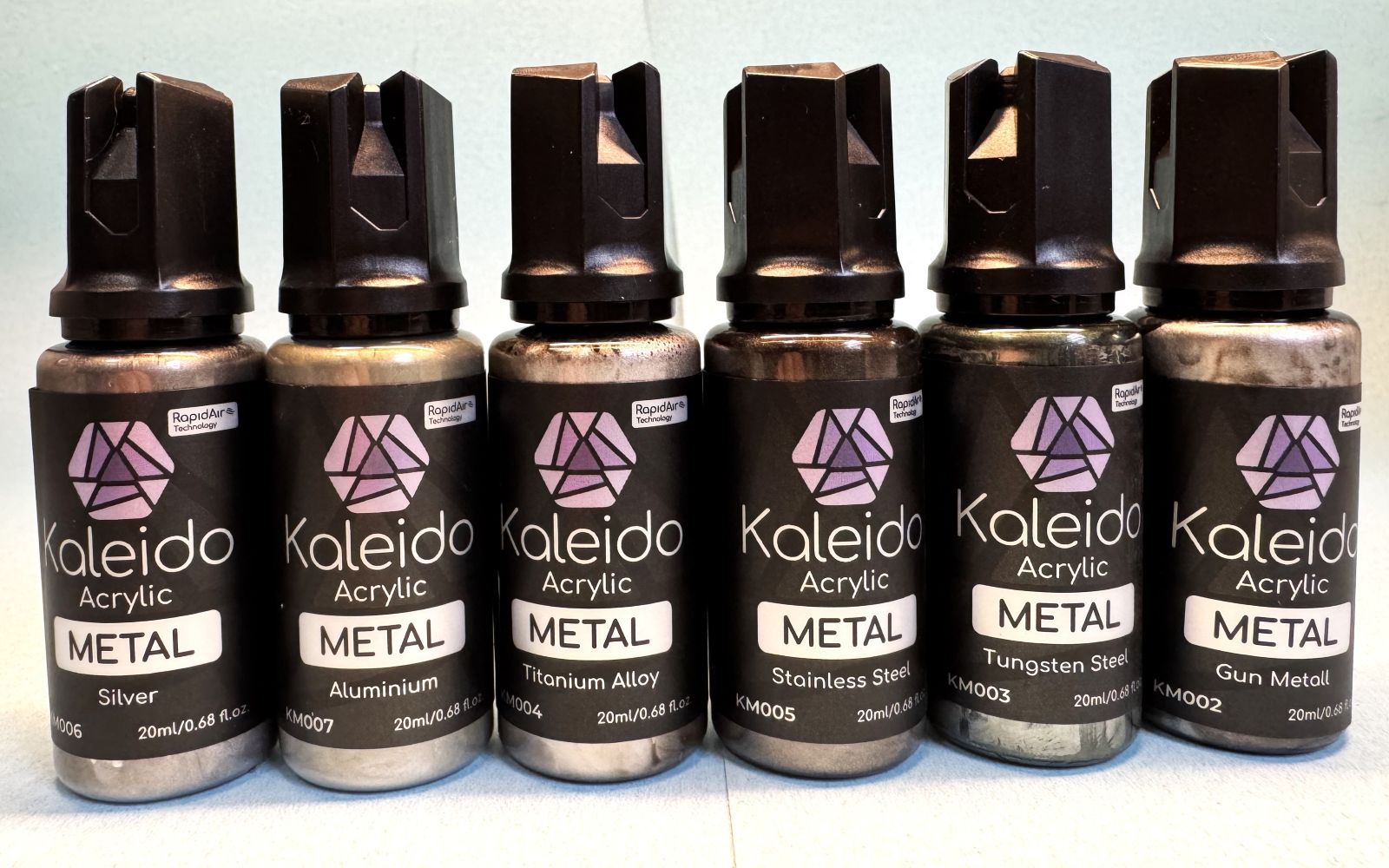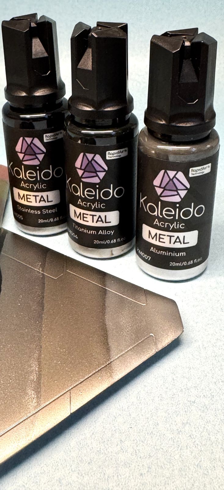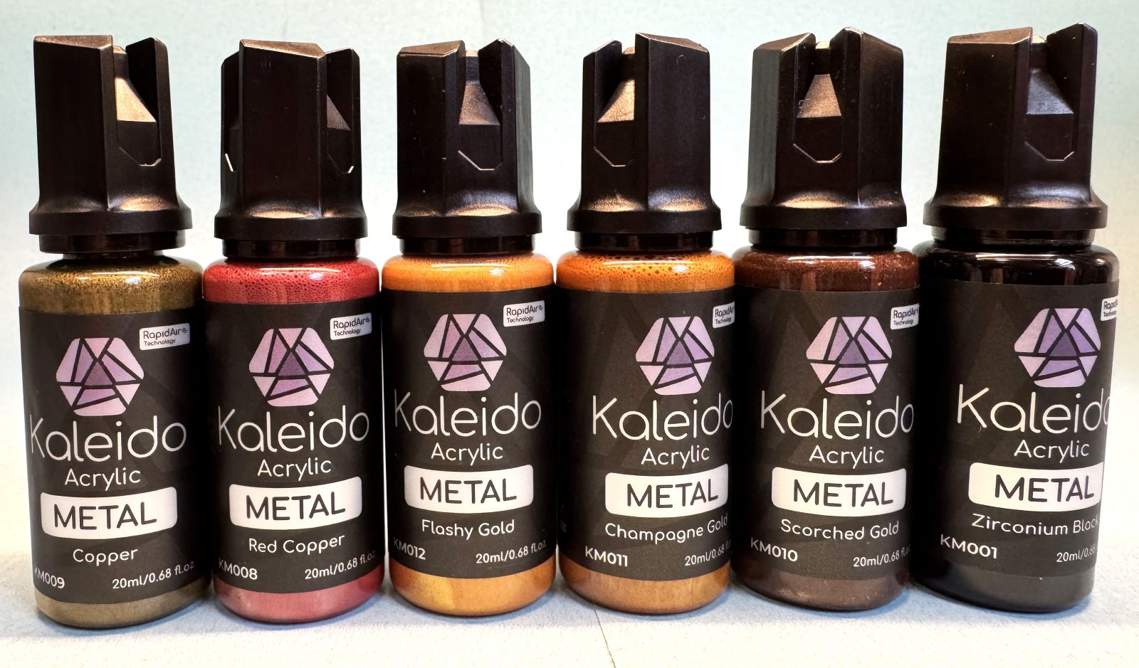 One of the latest releases is the 12 Metal Colors Set. Using their Rapid Air Technology, the paints deliver a lacquer-like performance in a water-based paint that is non-toxic and environmentally responsible (as described on their website). These paints are formulated for airbrushing and are contained in unique 20ml bottles made of clear plastic that supports easy viewing of the paint. I find this most appropriate for allowing you to verify that the paint is thoroughly mixed up prior to use. The bottles also contain a mixing ball for your convenience, and there is a tip that allows you to release the paint drop by drop.