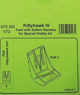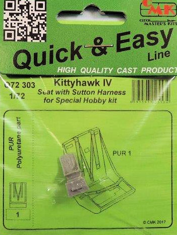 CMK has produced a very nicely detailed resin seat for the 1/72 Special Hobby Kittyhawk IV kit. The supplied items include the seat frame, with the British Sutton Harness molded on. Although made for the Special Hobby Kittyhawk IV kits, the seat should be adaptable to any of the 1/72 Kittyhawk IV kits currently on the market. I dry-fitted to my Academy example (see photos).
