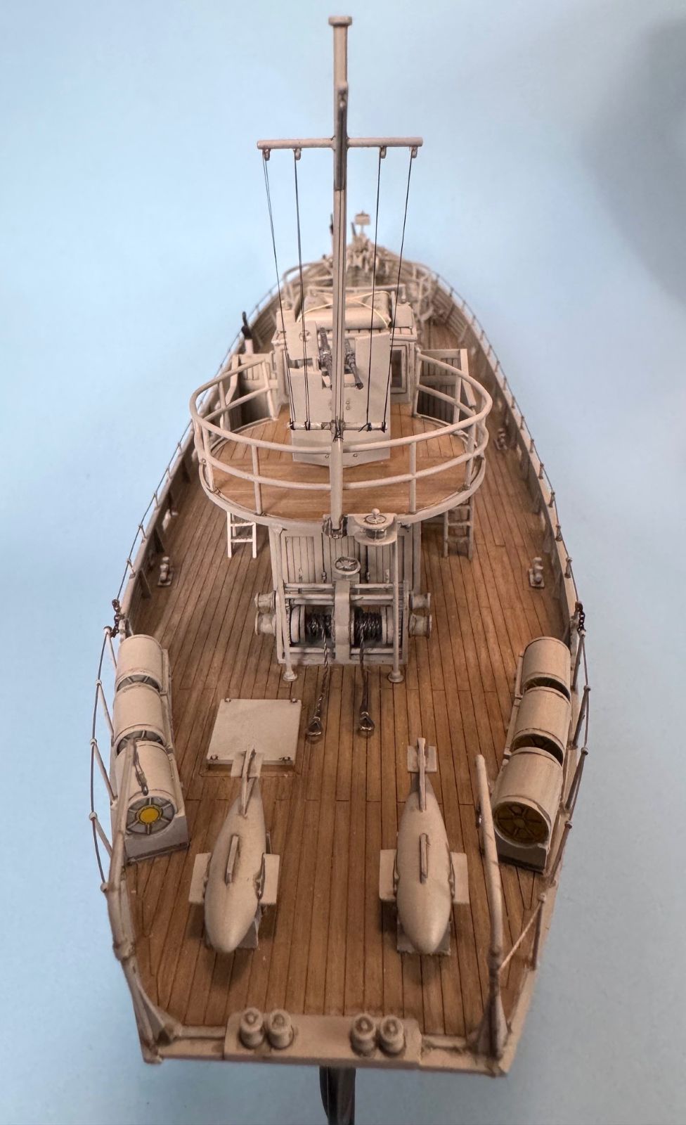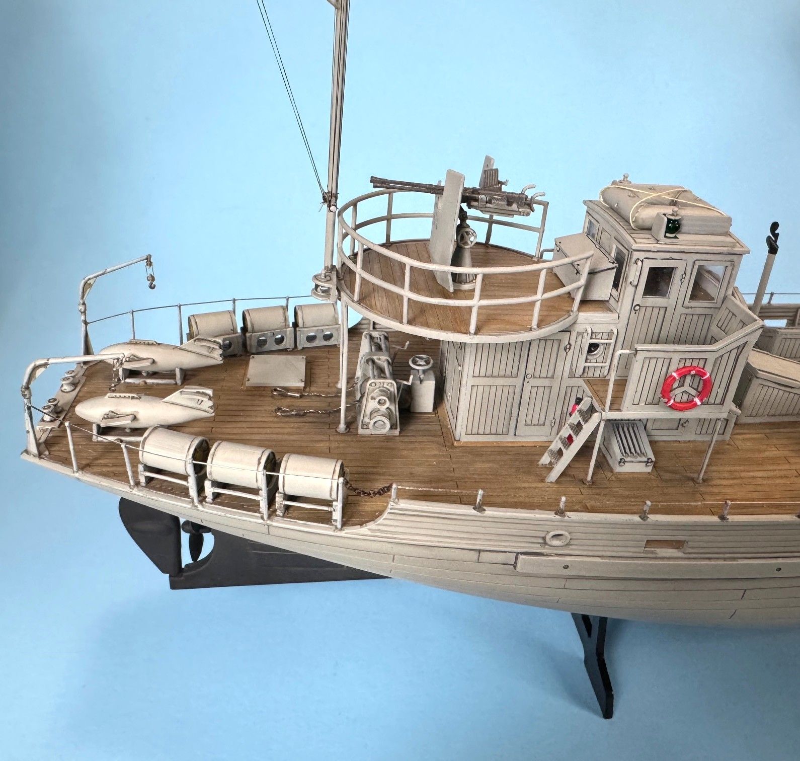 I pulled out some 0.30mm Silver Beading Wire to recreate the railing around the boat and used some small chains to create the openings for boarding and departing the boat in port. Infini Fine 1/48 Aero Black Rigging (0.082mm) was used for the mast lines, and some small diameter stainless steel wire was used for the hoists. I used a slightly larger chain for the anchor than I used for the railing openings, and 0.3mm ship rigging line was used to “secure” the two rafts.