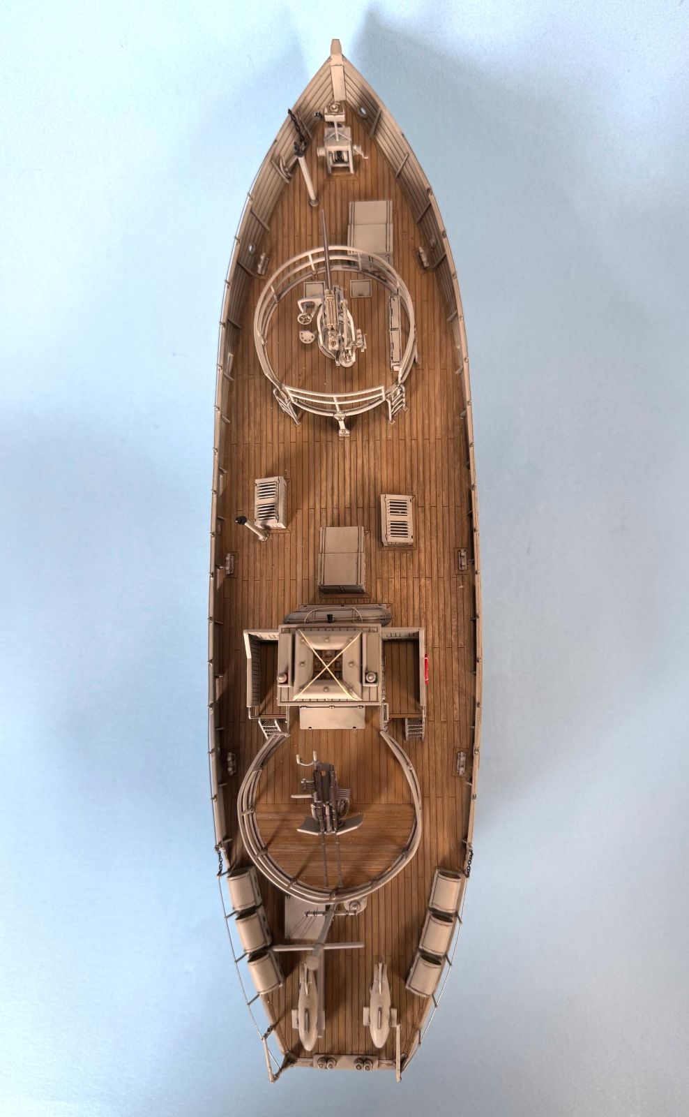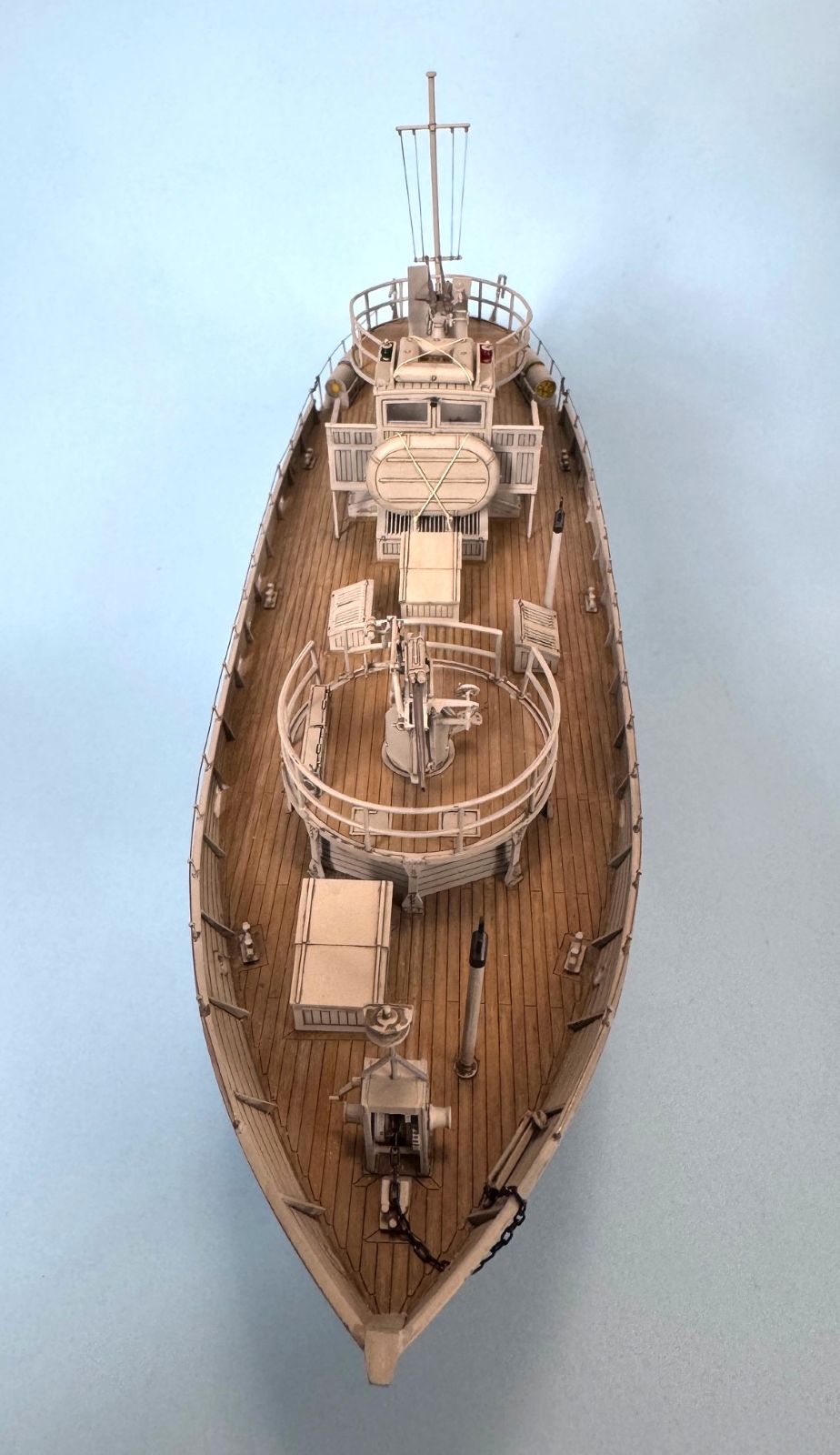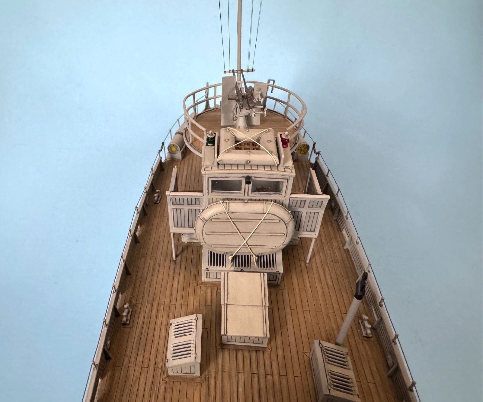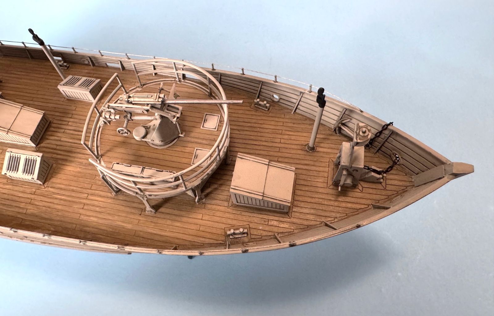 My one real miss about this kit was the flat railings provided for the gun platforms. No suggestions are provided on how to roll them for installation, and in my over 50 years of modeling, I have not run into such an issue. I first tried placing a section on an appropriately sized container and waving it over a candle a few inches above the flame. This resulted in creating a droop in one spot that I fought for the remainder of the build. I had better success dipping the parts wrapped around a container in water heated to 170F. The results were not perfect, but it was at least “OK.” If a 3D printed resin set of railings became available, I would replace mine in a heartbeat.