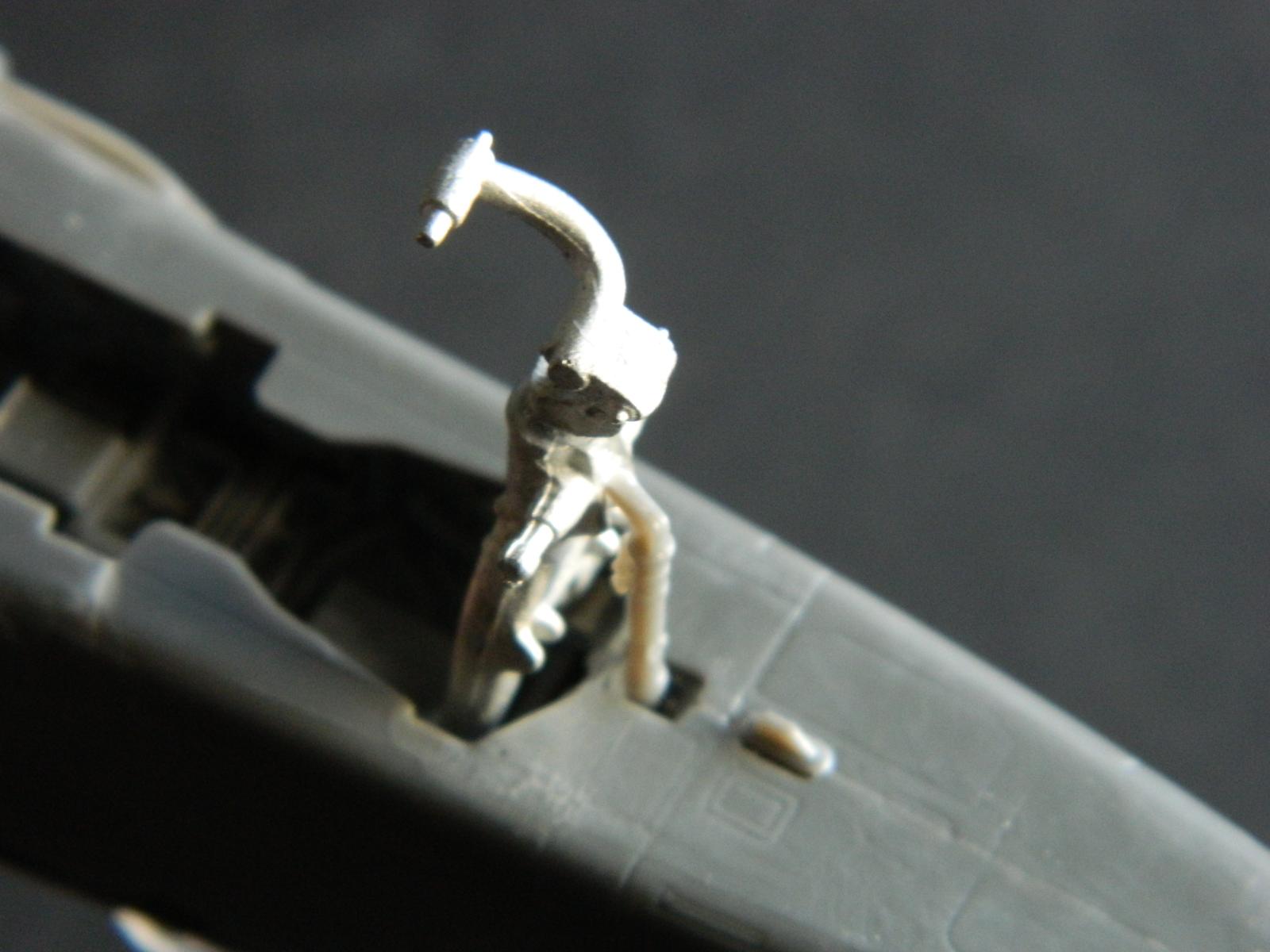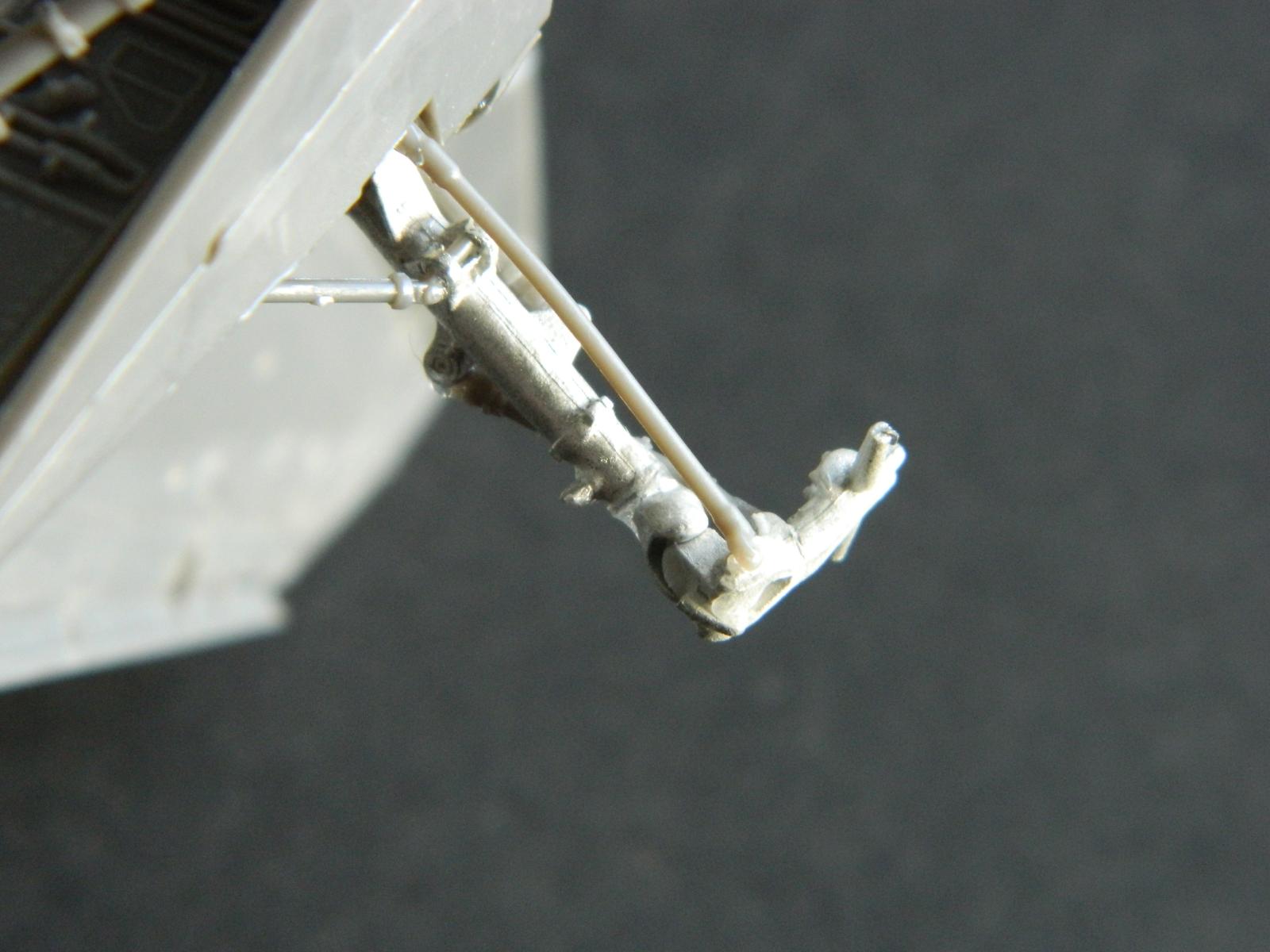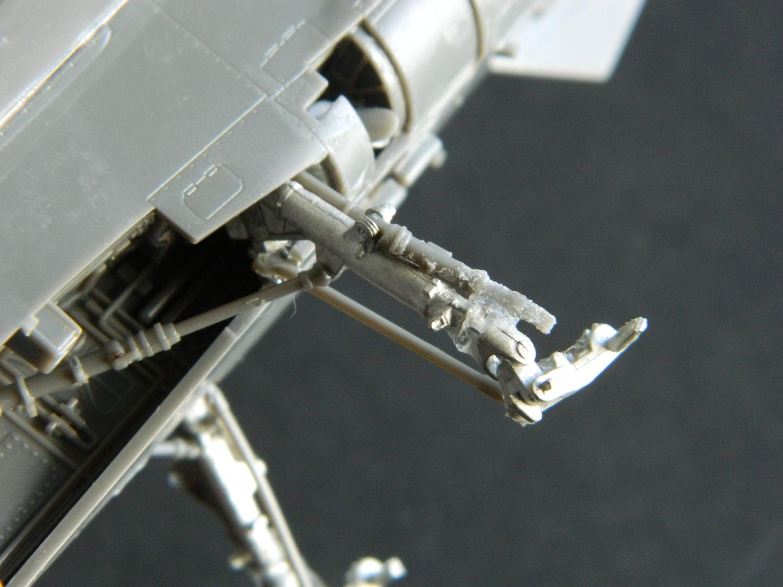 The addition of lateral side-mounted shrink struts and shock absorbers were next, and it all fit into place. These are kit plastic items, as are the retraction rams on the front of the gear. The way I look at it, if I can do it, anyone can. Just be patient.