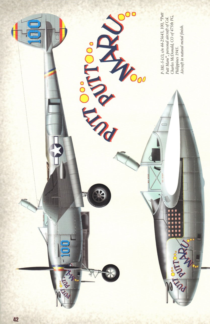The book contains scale plans, both in 1/72nd and 1/48th, showing top/bottom/side views of the various versions of the P-38J-L. These scaled views are accompanied by full-color (or colour) profiles showing many of the famous and colorful paint schemes and personalized markings that modelers favor.