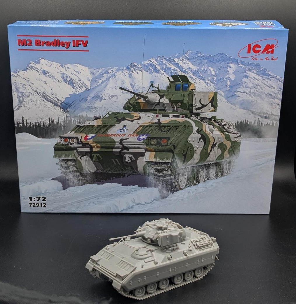 This is a former Revell M2/M3 Bradley kit (No. 03143) that was first issued in 2005 (with the hull tub dating to 2001 Kit No. 03124). The ICM boxing uses new decals and keeps it relevant for modern armor builders. The inclusion of decals for four colorful Bradleys, where only one is overall green, is nice and really highlights the M2 Bradley’s early career.